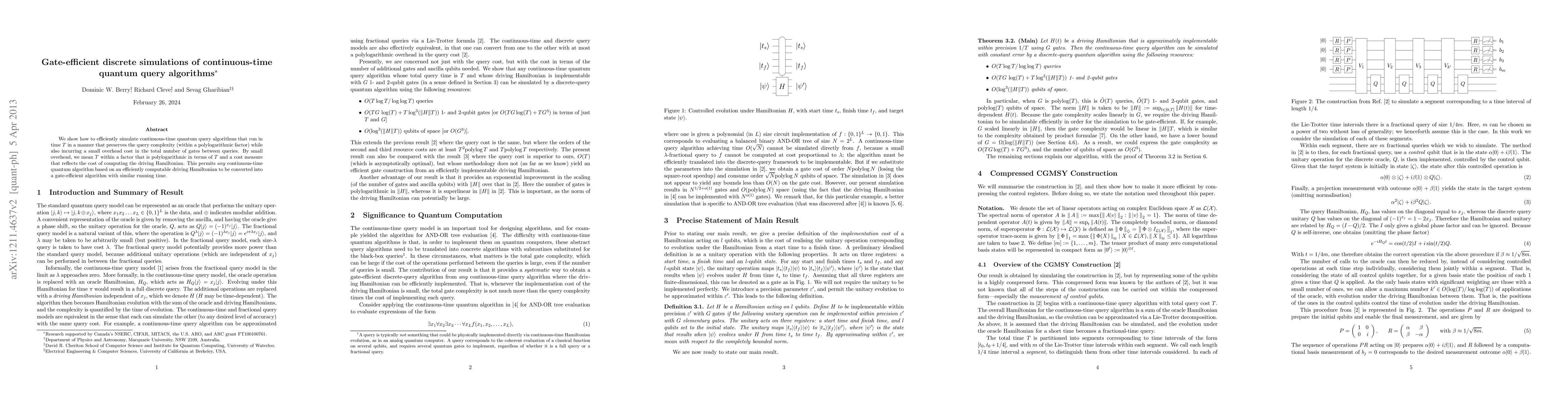 We show how to efficiently simulate continuous-time quantum query algorithms that run in time T in a manner that preserves the query complexity (within a polylogarithmic factor) while also incurring a small overhead cost in the total number of gates between queries. By small overhead, we mean T within a factor that is polylogarithmic in terms of T and a cost measure that reflects the cost of computing the driving Hamiltonian. This permits any continuous-time quantum algorithm based on an efficiently computable driving Hamiltonian to be converted into a gate-efficient algorithm with similar running time.