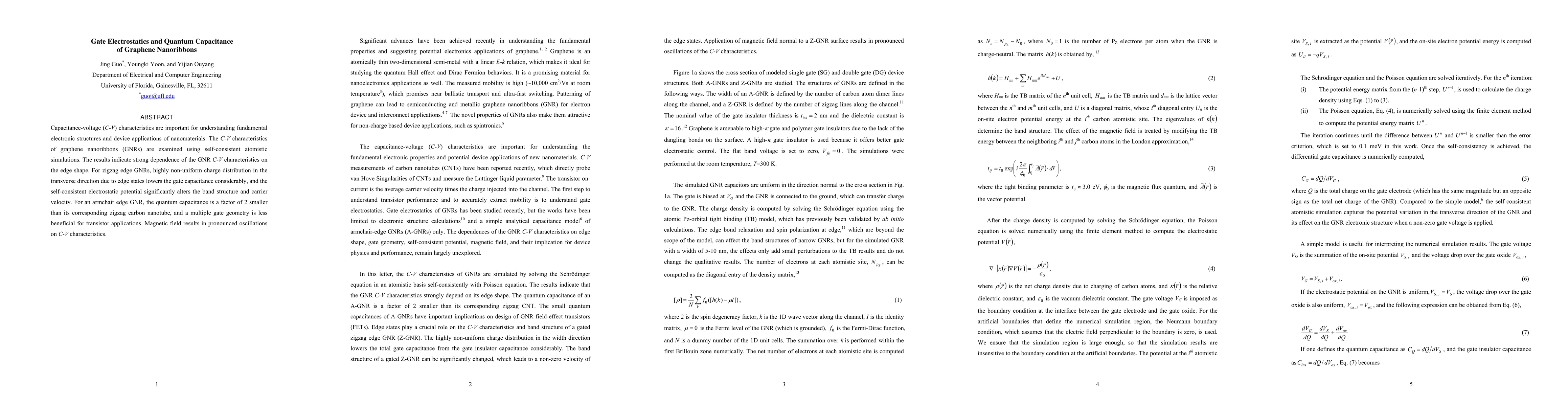 This study uses self-consistent atomistic simulations to explore the capacitance-voltage characteristics of graphene nanoribbons (GNRs), showing that zigzag edges lead to significant non-uniform charge distribution and lower gate capacitance, while armchair edges exhibit a quantum capacitance that is half that of zigzag carbon nanotubes, and magnetic fields induce notable C-V oscillations.