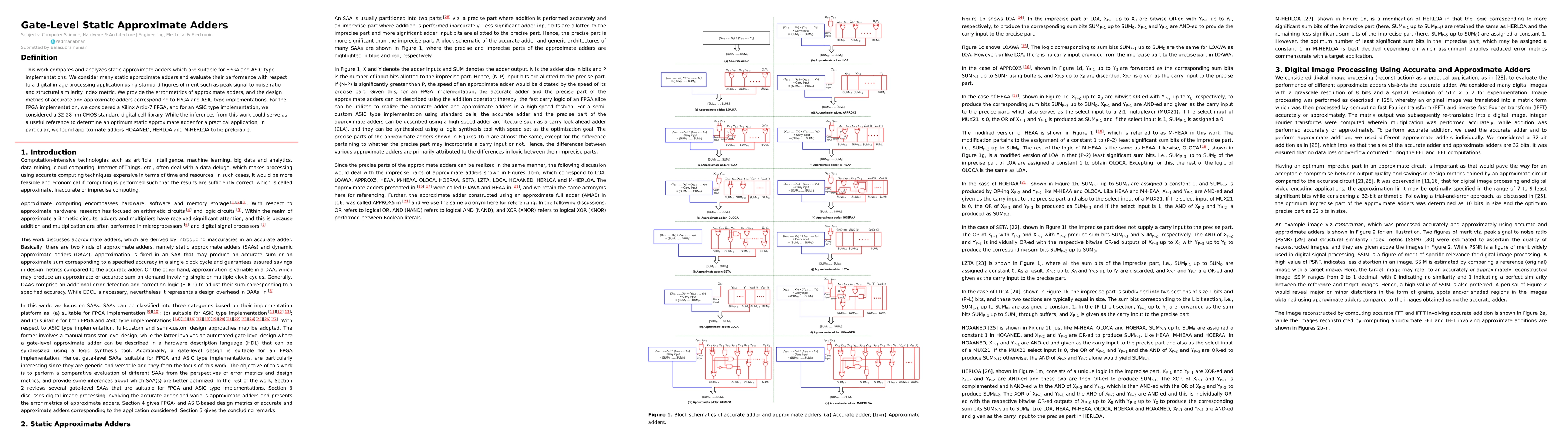 This study evaluates various static approximate adders for FPGA and ASIC implementations, analyzing their performance through image processing applications using metrics like PSNR and SSIM. The research highlights HOAANED, HERLOA, and M-HERLOA as preferable options for practical applications.