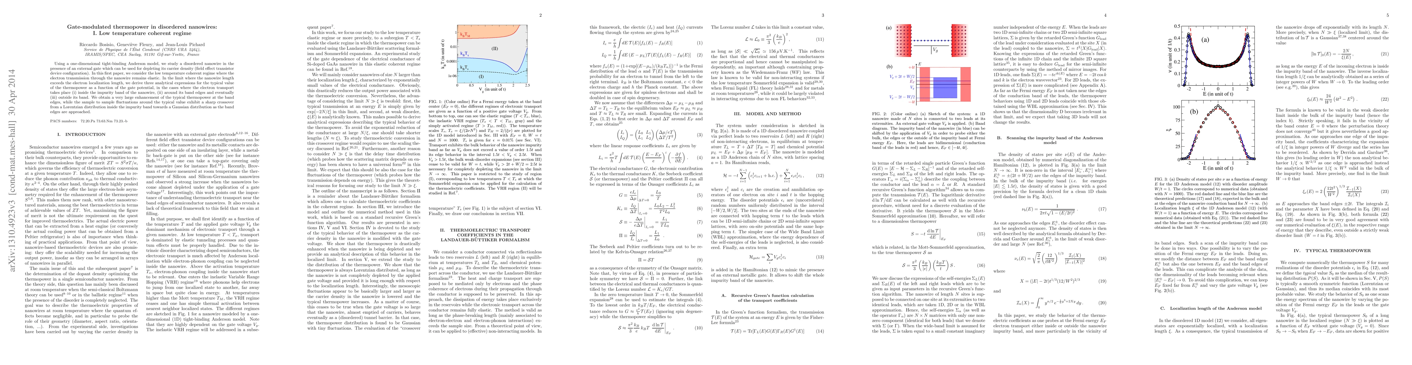 Using a one-dimensional tight-binding Anderson model, we study a disordered nanowire in the presence of an external gate which can be used for depleting its carrier density (field effect transistor device configuration). In this first paper, we consider the low temperature coherent regime where the electron transmission through the nanowire remains elastic. In the limit where the nanowire length exceeds the electron localization length, we derive three analytical expressions for the typical value of the thermopower as a function of the gate potential, in the cases where the electron transport takes place (i) inside the impurity band of the nanowire, (ii) around its band edges and eventually (iii) outside its band. We obtain a very large enhancement of the typical thermopower at the band edges, while the sample to sample fluctuations around the typical value exhibit a sharp crossover from a Lorentzian distribution inside the impurity band towards a Gaussian distribution as the band edges are approached.