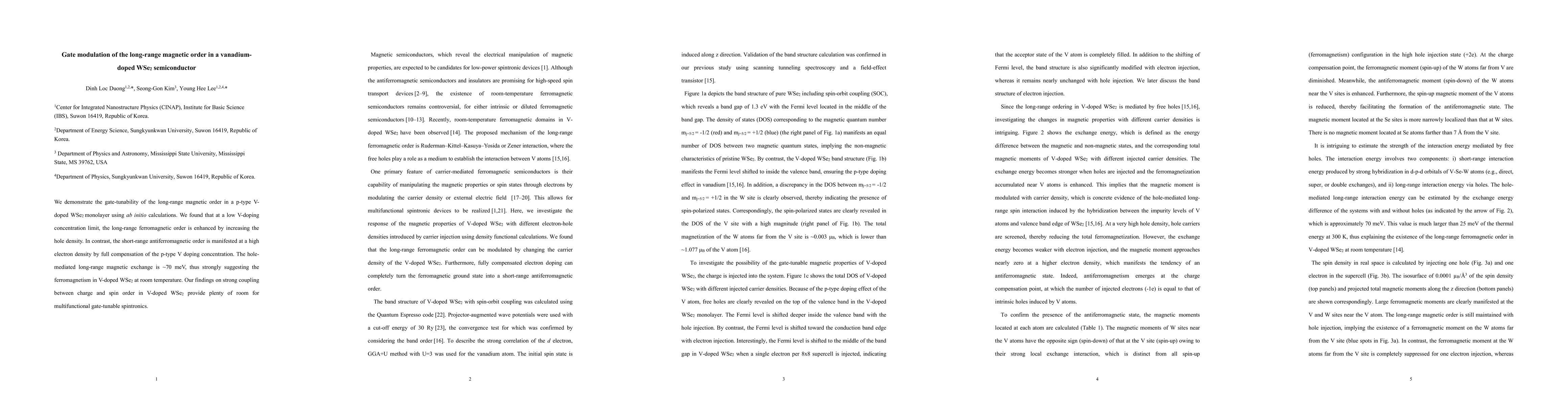 This paper demonstrates that gate modulation can enhance long-range ferromagnetic order in p-type vanadium-doped WSe2 monolayers, while high electron density compensates for p-type doping, inducing short-range antiferromagnetic order. The findings suggest strong coupling between charge and spin, promising potential for gate-tunable spintronics applications.