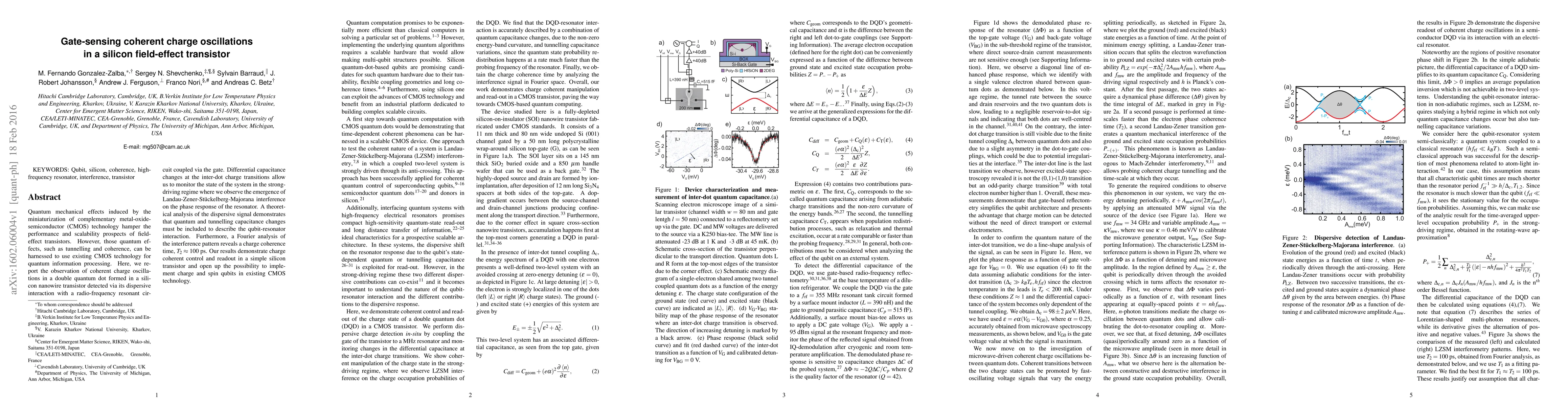 Quantum mechanical effects induced by the miniaturization of complementary metal-oxide-semiconductor (CMOS) technology hamper the performance and scalability prospects of field-effect transistors. However, those quantum effects, such as tunnelling and coherence, can be harnessed to use existing CMOS technology for quantum information processing. Here, we report the observation of coherent charge oscillations in a double quantum dot formed in a silicon nanowire transistor detected via its dispersive interaction with a radio-frequency resonant circuit coupled via the gate. Differential capacitance changes at the inter-dot charge transitions allow us to monitor the state of the system in the strong-driving regime where we observe the emergence of Landau-Zener-St{\"u}ckelberg-Majorana interference on the phase response of the resonator. A theoretical analysis of the dispersive signal demonstrates that quantum and tunnelling capacitance changes must be included to describe the qubit-resonator interaction. Furthermore, a Fourier analysis of the interference pattern reveals a charge coherence time, $T_2\approx 100$~ps. Our results demonstrate charge coherent control and readout in a simple silicon transistor and open up the possibility to implement charge and spin qubits in existing CMOS technology.