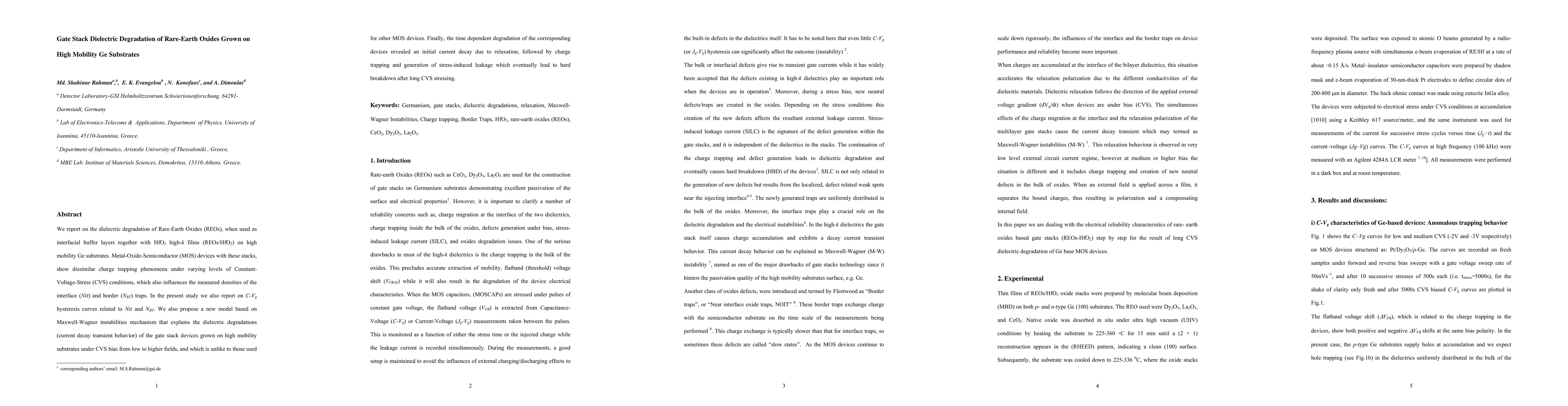 Researchers investigated the degradation of Rare-Earth Oxides on high mobility Ge substrates in MOS devices under constant-voltage-stress conditions, finding a new model explaining current decay and stress-induced leakage.