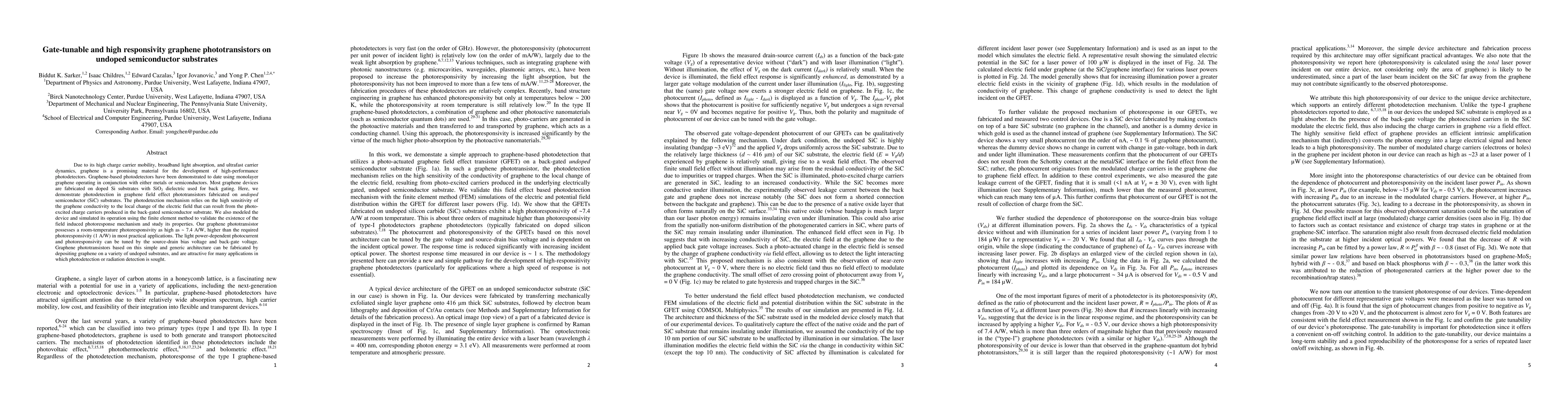 This paper demonstrates high-performance graphene phototransistors on undoped SiC substrates, achieving room-temperature responsivity of ~7.4 A/W. The photodetection mechanism relies on the sensitivity of graphene's conductivity to the electric field changes from photo-excited carriers in the substrate, which can be tuned by bias voltages.