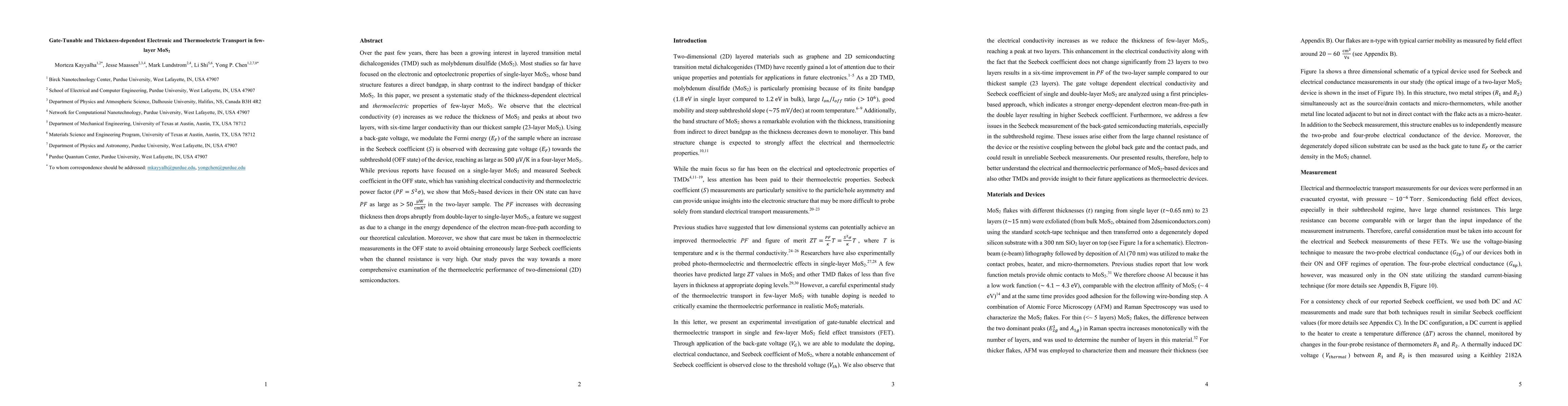 This study investigates the thickness-dependent electrical and thermoelectric properties of few-layer MoS2, revealing that conductivity peaks at about two layers and decreases with increasing thickness. The Seebeck coefficient increases with reduced gate voltage and is significantly higher in the ON state compared to the OFF state, highlighting the importance of device state in thermoelectric performance.