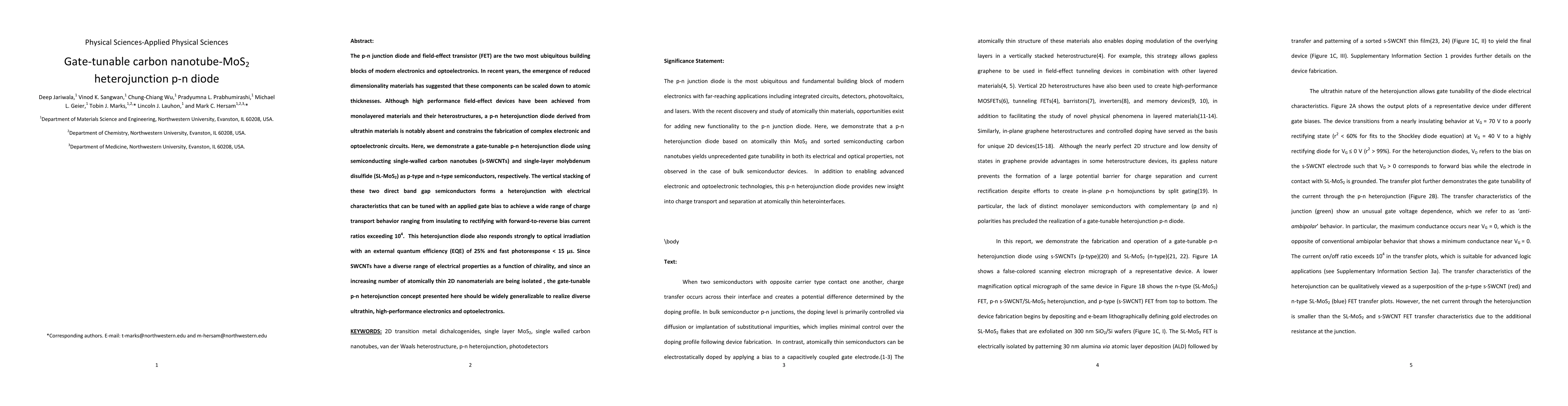 The research introduces a new concept for realizing ultrathin, high-performance electronics and optoelectronics by combining semiconducting single-walled carbon nanotubes with single-layer molybdenum disulfide, enabling gate-tunable p-n heterojunction diodes.