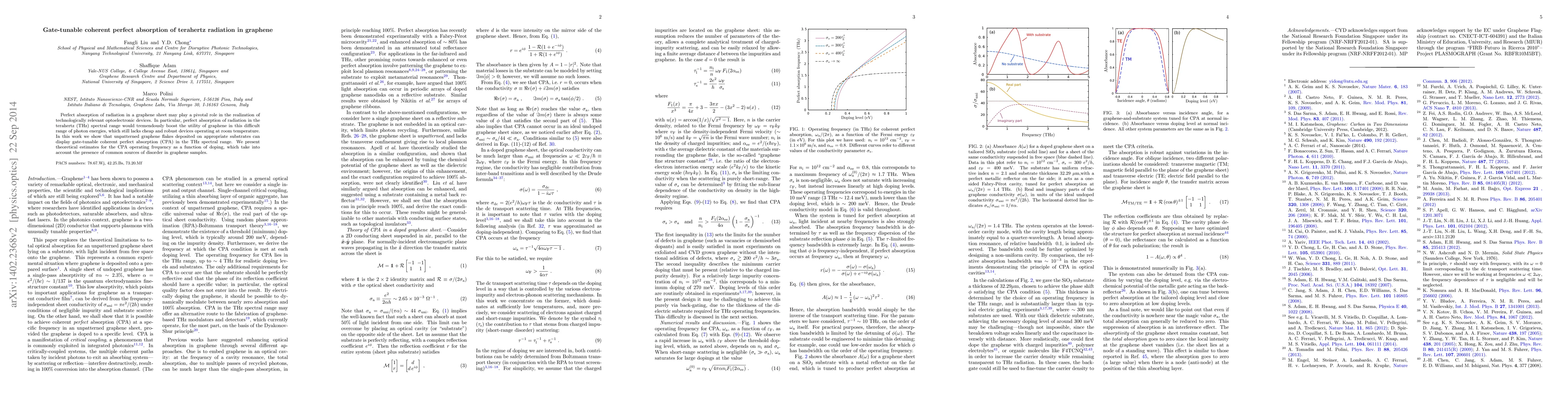 This paper demonstrates that unpatterned graphene flakes can achieve gate-tunable coherent perfect absorption (CPA) in the terahertz range, enhancing graphene's potential for optoelectronic devices. Theoretical models predict the CPA operating frequency's dependence on doping, considering typical graphene disorder.