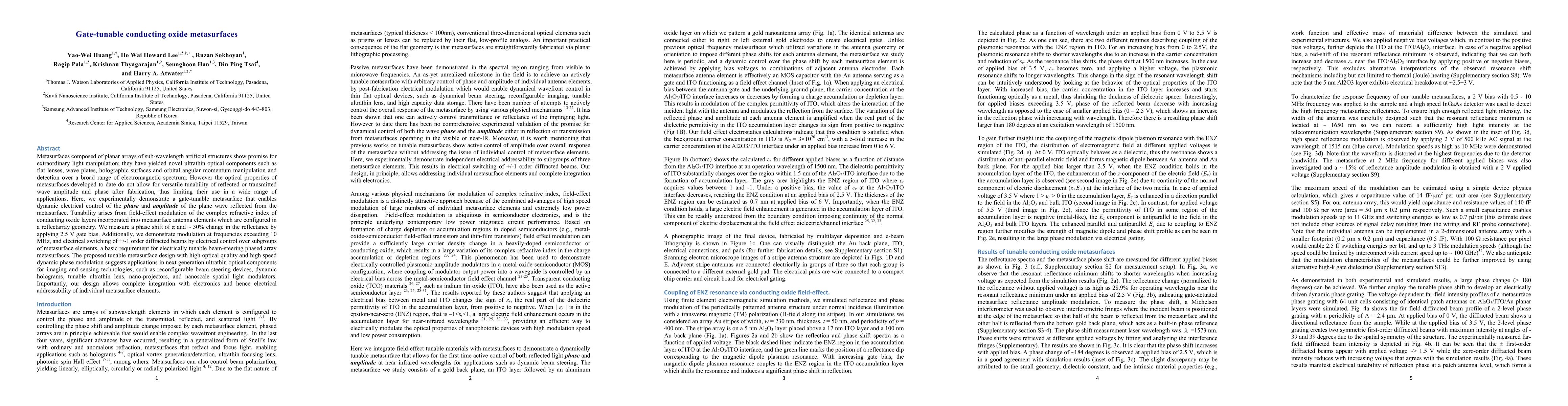 This paper presents a gate-tunable metasurface that enables dynamic electrical control of the phase and amplitude of reflected light, achieved through field-effect modulation of conducting oxide layers in metasurface antenna elements. The design allows for high-speed modulation and electrical switching of diffracted beams, enabling applications in reconfigurable optical components and imaging technologies.