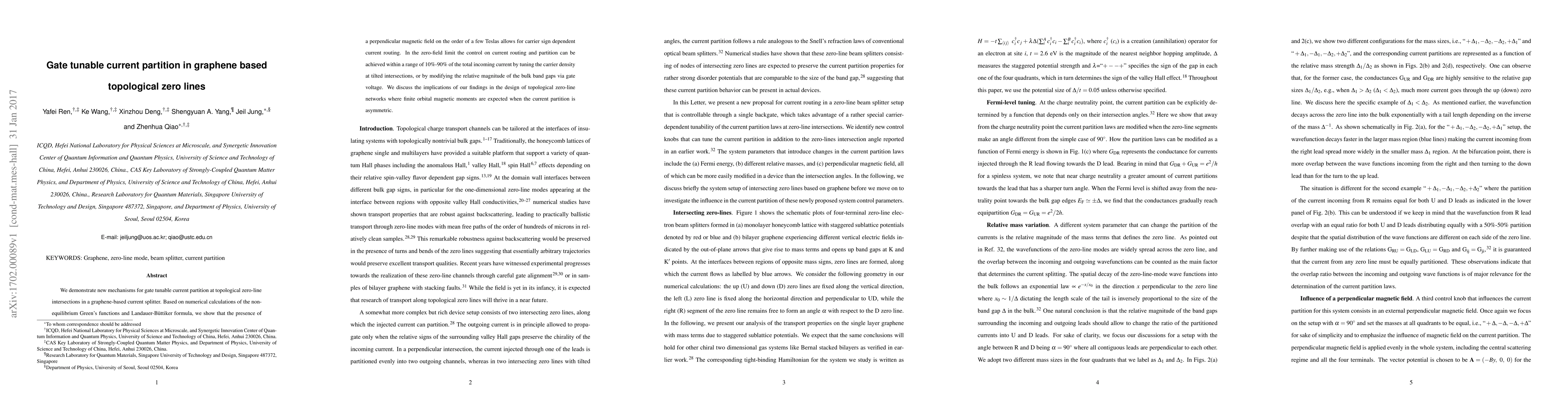 We demonstrate new mechanisms for gate tunable current partition at topological zero-line intersections in a graphene-based current splitter. Based on numerical calculations of the non-equilibrium Green's functions and Landauer-B\"{u}ttiker formula, we show that the presence of a perpendicular magnetic field on the order of a few Teslas allows for carrier sign dependent current routing. In the zero-field limit the control on current routing and partition can be achieved within a range of $10\%$-$90\%$ of the total incoming current by tuning the carrier density at tilted intersections, or by modifying the relative magnitude of the bulk band gaps via gate voltage. We discuss the implications of our findings in the design of topological zero-line networks where finite orbital magnetic moments are expected when the current partition is asymmetric.
