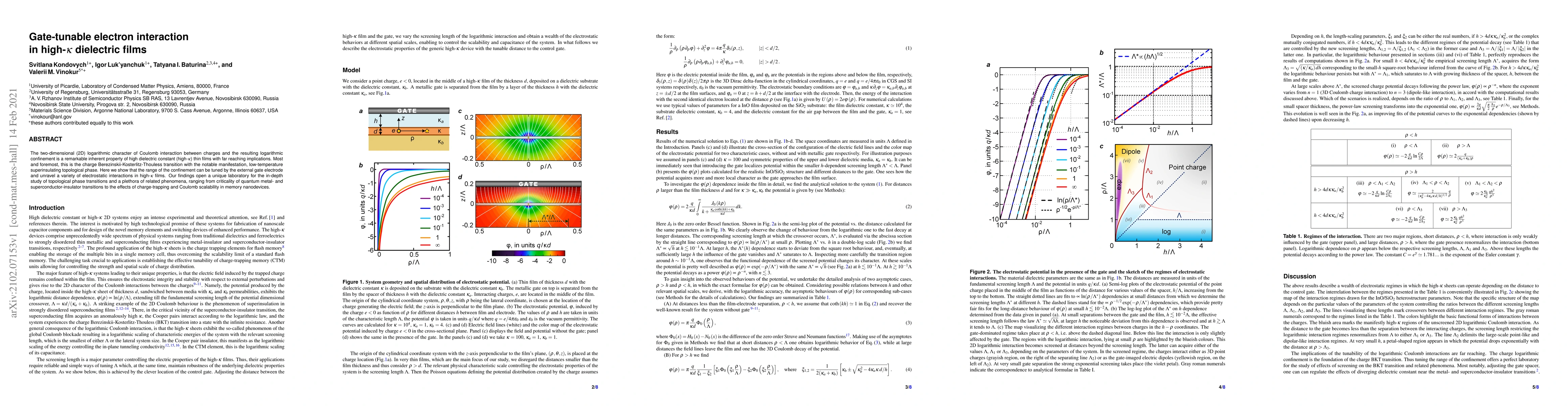 The two-dimensional (2D) logarithmic character of Coulomb interaction between charges and the resulting logarithmic confinement is a remarkable inherent property of high dielectric constant (high-$\kappa$) thin films with far reaching implications. Most and foremost, this is the charge Berezinskii-Kosterlitz-Thouless transition with the notable manifestation, low-temperature superinsulating topological phase. Here we show that the range of the confinement can be tuned by the external gate electrode and unravel a variety of electrostatic interactions in high-$\kappa$ films. We find that by reducing the distance from the gate to the film, we decrease the spatial range of the 2D long-range logarithmic interaction, changing it to predominantly dipolar or even to exponential one at lateral distances exceeding the dimension of the film-gate separation. Our findings offer a unique laboratory for the in-depth study of topological phase transitions and related phenomena that range from criticality of quantum metal- and superconductor-insulator transitions to the effects of charge-trapping and Coulomb scalability in memory nanodevices.