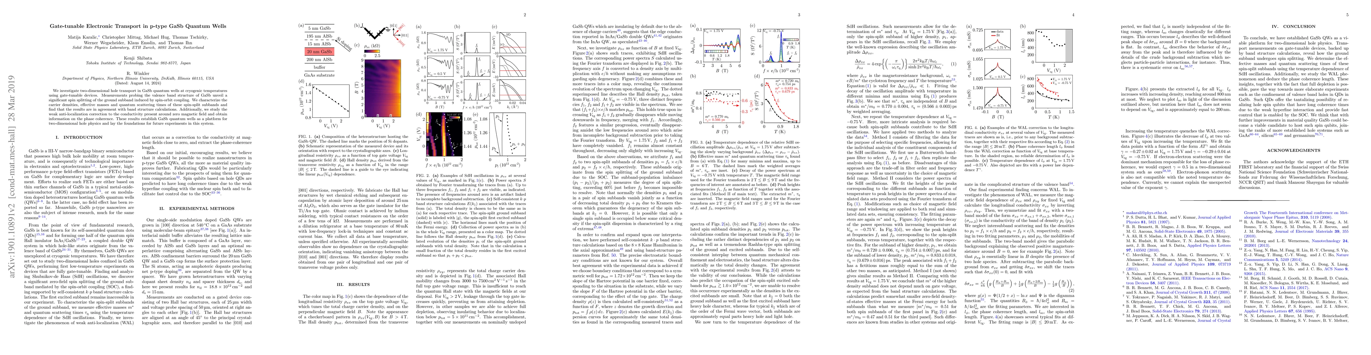 We investigate two-dimensional hole transport in GaSb quantum wells at cryogenic temperatures using gate-tunable devices. Measurements probing the valence band structure of GaSb unveil a significant spin splitting of the ground subband induced by spin-orbit coupling. We characterize the carrier densities, effective masses and quantum scattering times of these spin-split subbands and find that the results are in agreement with band structure calculations. Additionally, we study the weak anti-localization correction to the conductivity present around zero magnetic field and obtain information on the phase coherence. These results establish GaSb quantum wells as a platform for two-dimensional hole physics and lay the foundations for future experiments in this system.