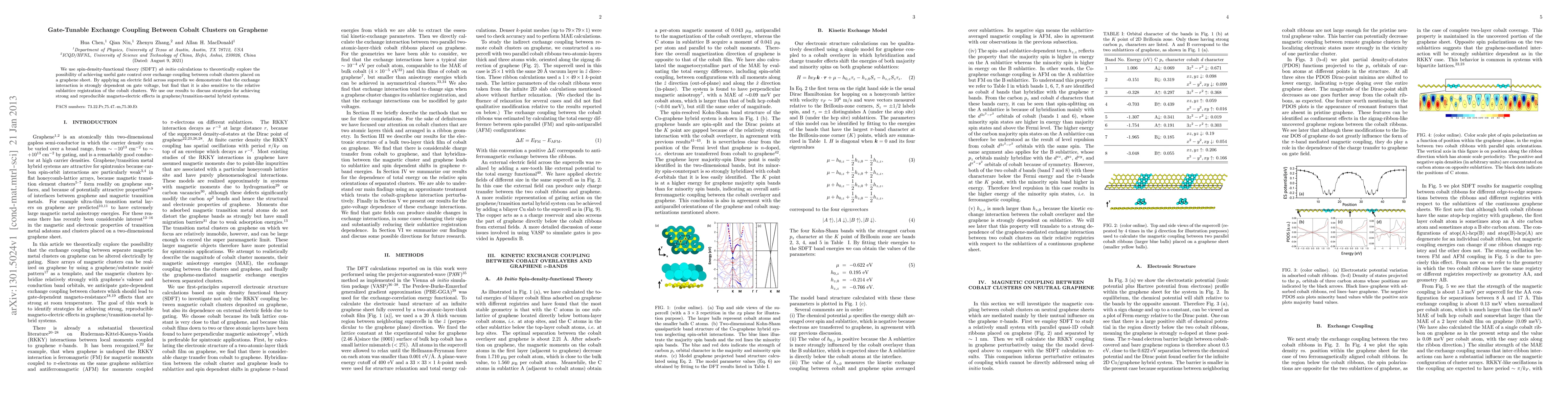 This paper explores the gate-tunable exchange coupling between cobalt clusters on graphene using SDFT calculations, showing that electric fields can modulate the interaction, though it is also affected by the clusters' sublattice registration, suggesting strategies for enhancing magneto-electric effects in graphene-based systems.