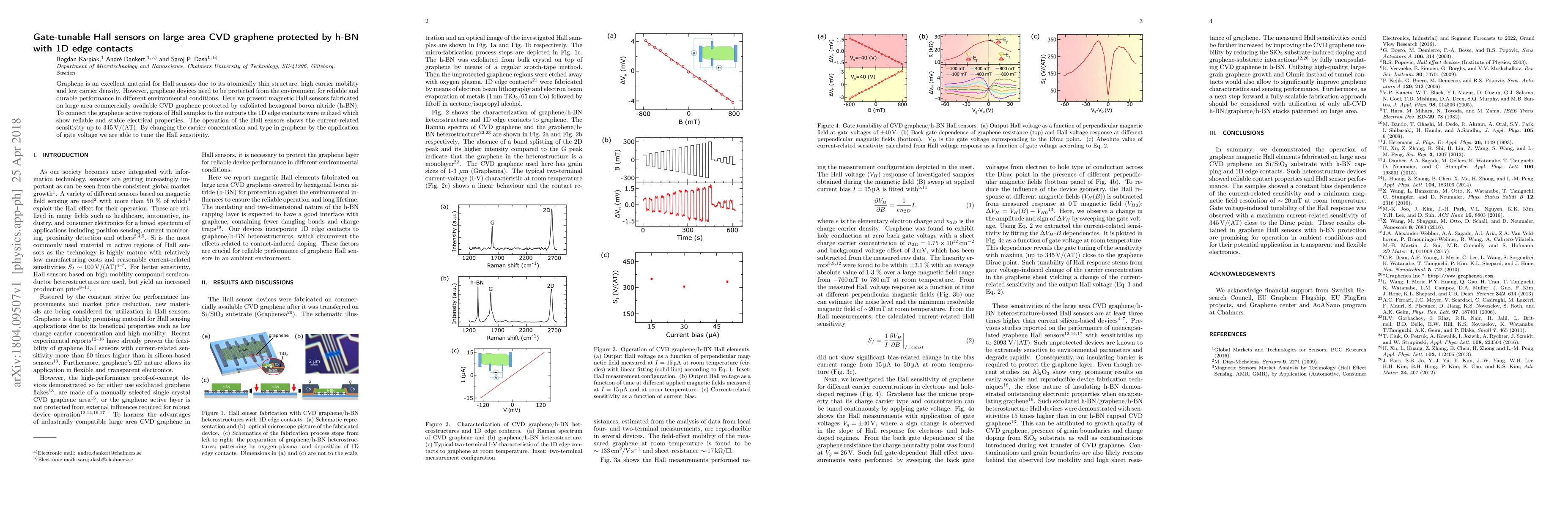 This study fabricates gate-tunable Hall sensors on large area CVD graphene protected by h-BN, utilizing 1D edge contacts. The sensors demonstrate high sensitivity up to 345 V/(AT) and can be tuned by gate voltage, enabling adjustment of carrier concentration and type for optimal performance.