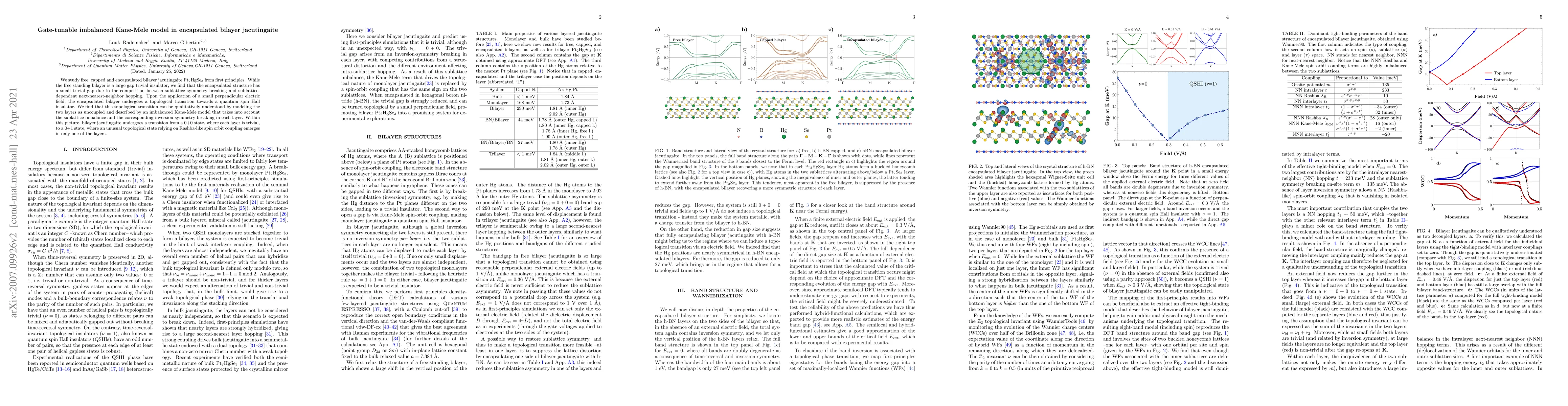 We study free, capped and encapsulated bilayer jacutingaite Pt$_2$HgSe$_3$ from first principles. While the free standing bilayer is a large gap trivial insulator, we find that the encapsulated structure has a small trivial gap due to the competition between sublattice symmetry breaking and sublattice-dependent next-nearest-neighbor hopping. Upon the application of a small perpendicular electric field, the encapsulated bilayer undergoes a topological transition towards a quantum spin Hall insulator. We find that this topological transition can be qualitatively understood by modeling the two layers as uncoupled and described by an imbalanced Kane-Mele model that takes into account the sublattice imbalance and the corresponding inversion-symmetry breaking in each layer. Within this picture, bilayer jacutingaite undergoes a transition from a 0+0 state, where each layer is trivial, to a 0+1 state, where an unusual topological state relying on Rashba-like spin orbit coupling emerges in only one of the layers.