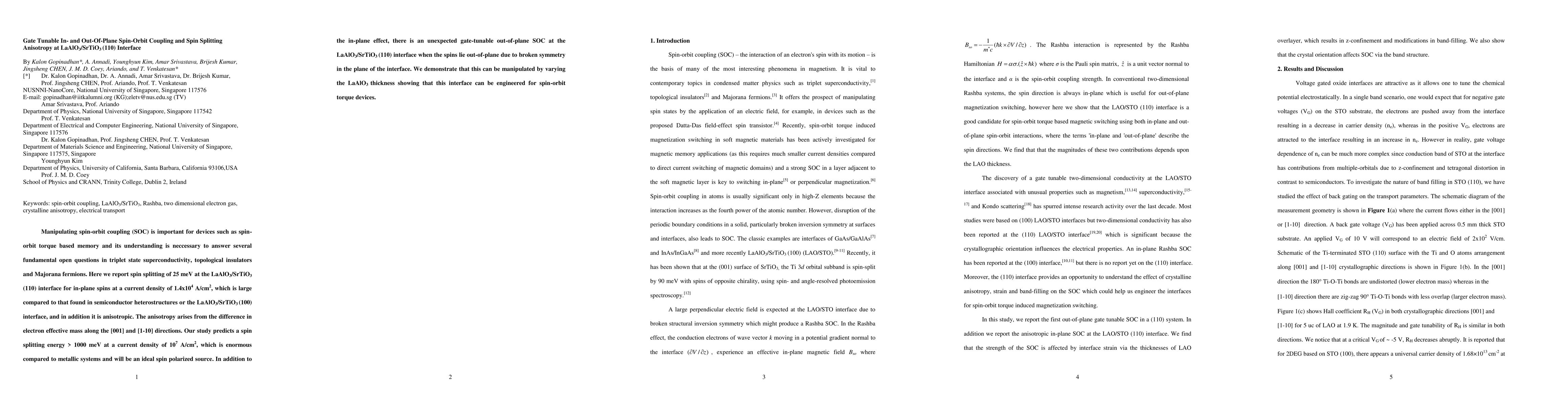 This paper reports significant gate-tunable spin-orbit coupling and anisotropic spin splitting at the LaAlO3/SrTiO3 (110) interface, with a large in-plane spin splitting of 25 meV and an out-of-plane effect that can be manipulated by varying LaAlO3 thickness, making it a promising candidate for spin-orbit torque devices.