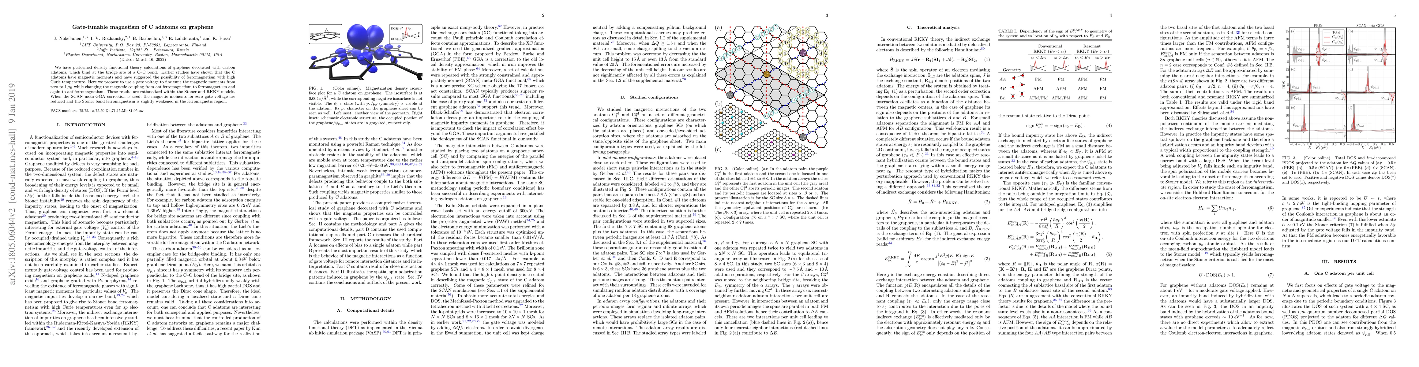 This study uses density functional theory to explore how gate voltage can manipulate the magnetism of carbon adatoms on graphene, showing tunable magnetic moments and coupling from antiferromagnetism to ferromagnetism and back, rationalized by the Stoner and RKKY models. The SCAN meta-GGA correction slightly reduces magnetic moments and weakens ferromagnetism at zero gate voltage.