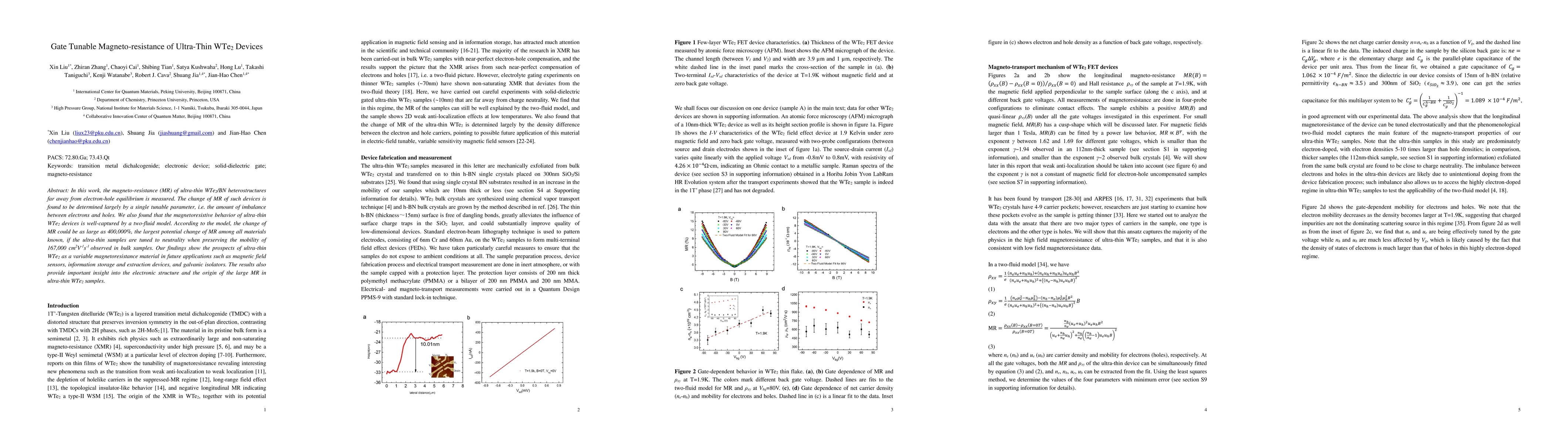 This study investigates the gate tunable magneto-resistance of ultra-thin WTe2/BN heterostructures, revealing that the magnetoresistive behavior is dominated by electron-hole imbalance. The two-fluid model predicts a potential MR change of up to 400,000% when tuned to neutrality, highlighting WTe2's potential for advanced magnetic field sensors and information devices.