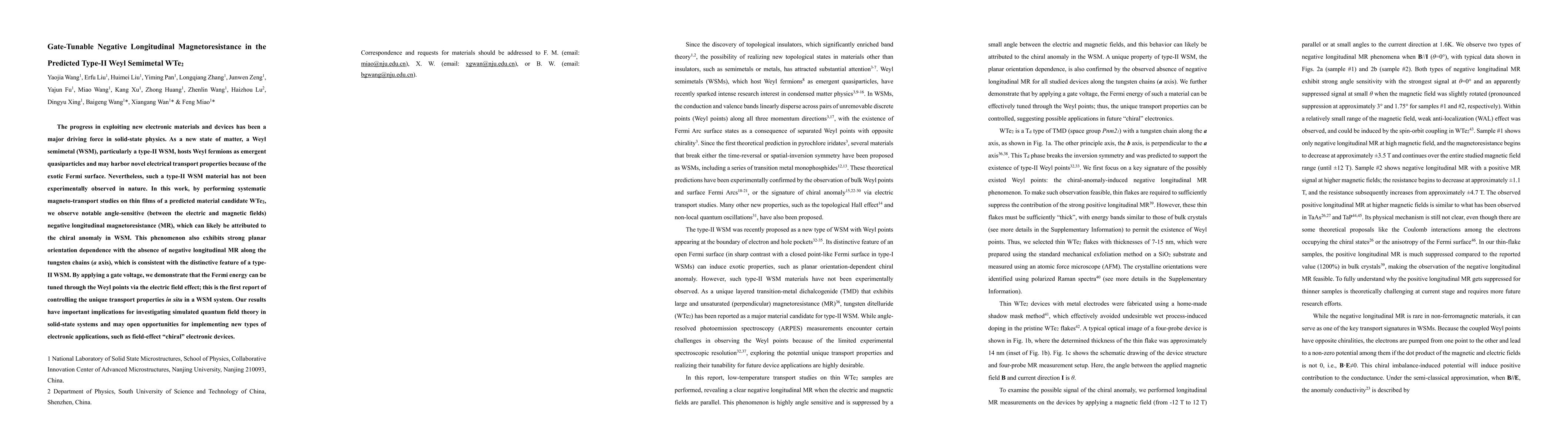 This study observes gate-tunable negative longitudinal magnetoresistance in WTe2, a predicted type-II Weyl semimetal, revealing angle-dependent transport properties likely due to the chiral anomaly. The gate voltage enables tuning of the Fermi energy through Weyl points, marking the first in situ control of unique transport properties in a WSM system, with potential implications for novel electronic applications.