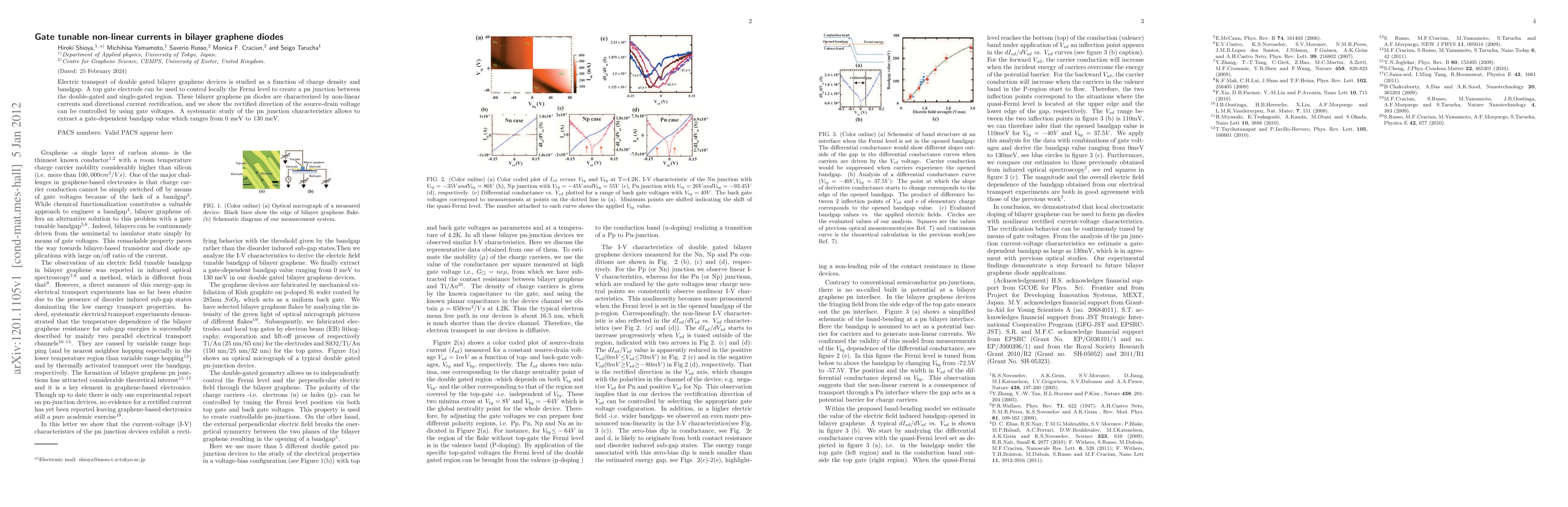 This study investigates the electric transport in bilayer graphene diodes with dual gate control, revealing non-linear currents and current rectification that can be tuned via gate voltages. The research identifies a gate-dependent bandgap ranging from 0 meV to 130 meV, showcasing the potential for gate-tunable pn junction characteristics.