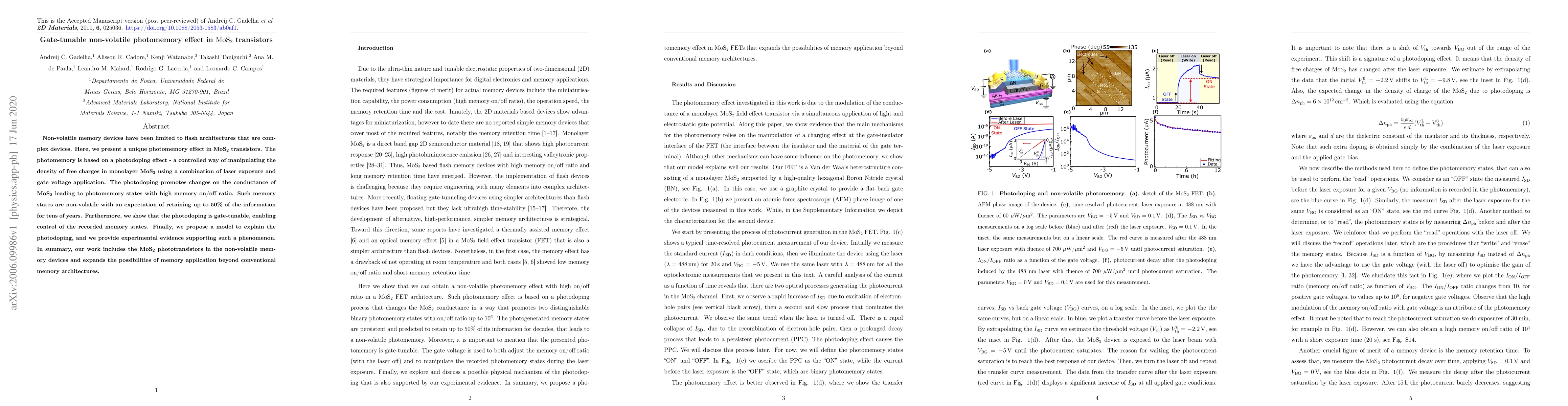 This research demonstrates a gate-tunable, non-volatile photomemory effect in monolayer MoS$_2$ transistors based on photodoping, achieving high memory retention and offering potential for new memory architectures beyond conventional flash devices. The study provides experimental evidence and a model explaining the photodoping mechanism.
