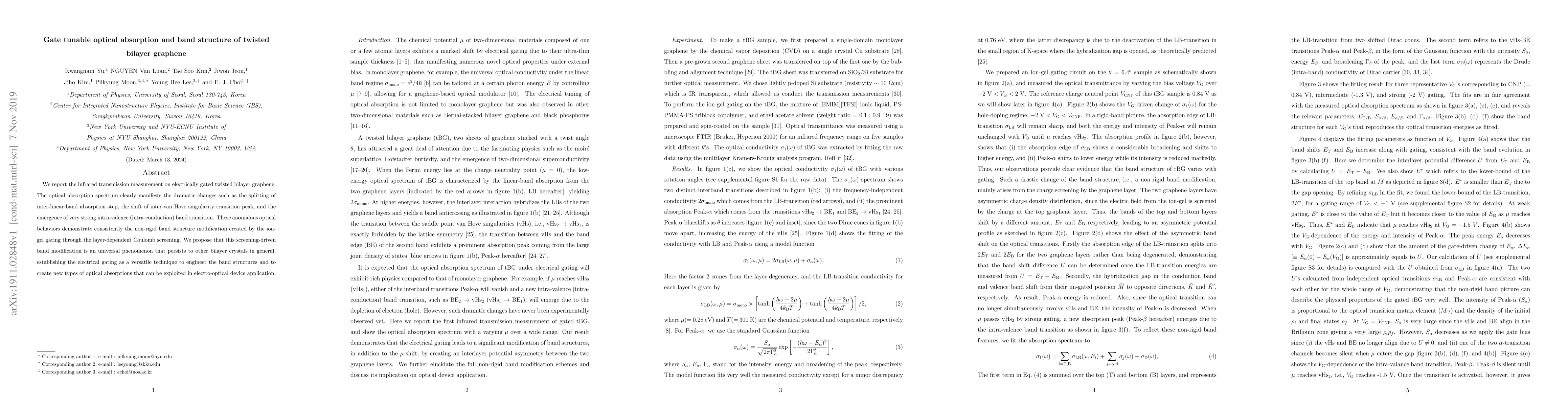 We report the infrared transmission measurement on electrically gated twisted bilayer graphene. The optical absorption spectrum clearly manifests the dramatic changes such as the splitting of inter-linear-band absorption step, the shift of inter-van Hove singularity transition peak, and the emergence of very strong intra-valence (intra-conduction) band transition. These anomalous optical behaviors demonstrate consistently the non-rigid band structure modification created by the ion-gel gating through the layer-dependent Coulomb screening. We propose that this screening-driven band modification is an universal phenomenon that persists to other bilayer crystals in general, establishing the electrical gating as a versatile technique to engineer the band structures and to create new types of optical absorptions that can be exploited in electro-optical device application.