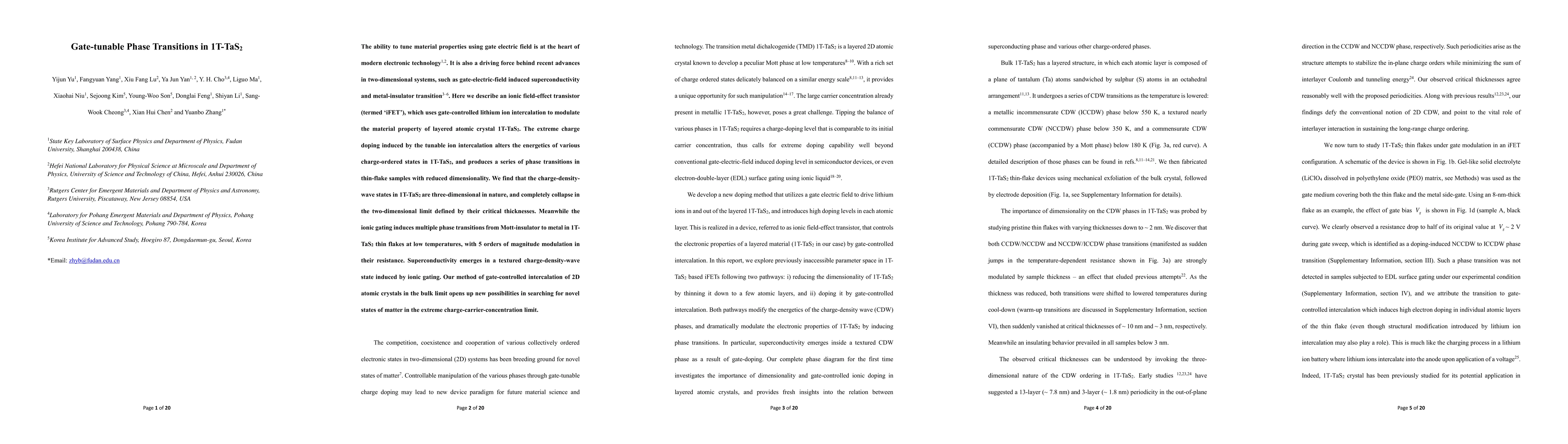 This paper details a novel ionic field-effect transistor (iFET) that modulates 1T-TaS$_2$ properties via gate-controlled lithium ion intercalation, inducing phase transitions from Mott insulator to metal and even superconductivity in thin flakes. The study reveals that charge-density-wave states in 1T-TaS$_2$ transition from three-dimensional to collapsed two-dimensional forms with critical thickness, highlighting potential for exploring new states of matter.