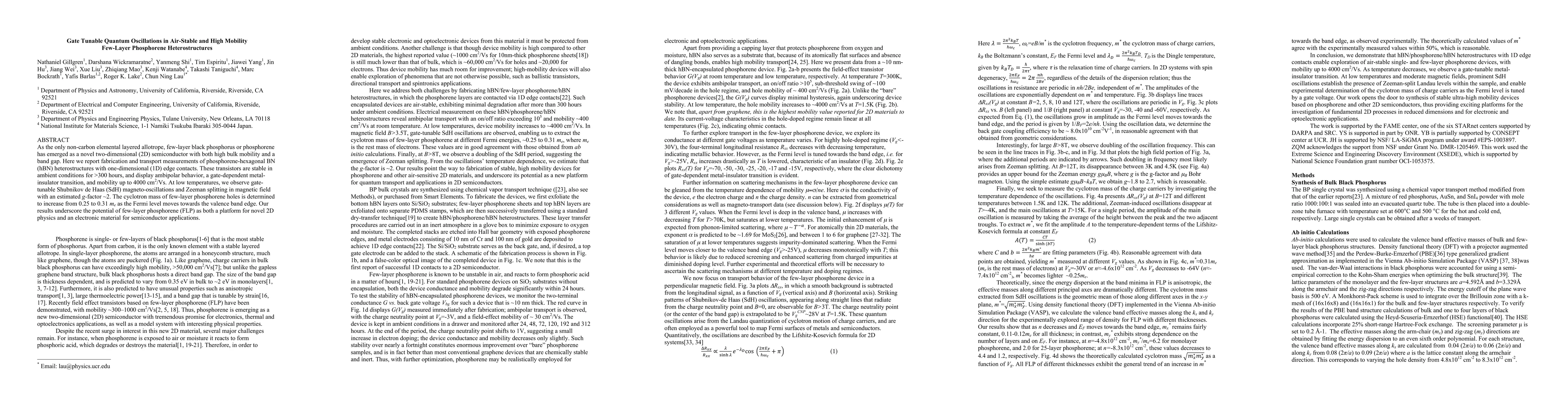 This paper details the fabrication of air-stable few-layer phosphorene-hBN heterostructures, showcasing high mobility and ambipolar behavior. At low temperatures, gate-tunable quantum oscillations and Zeeman splitting were observed, highlighting phosphorene's potential in 2D physics and semiconductor applications.