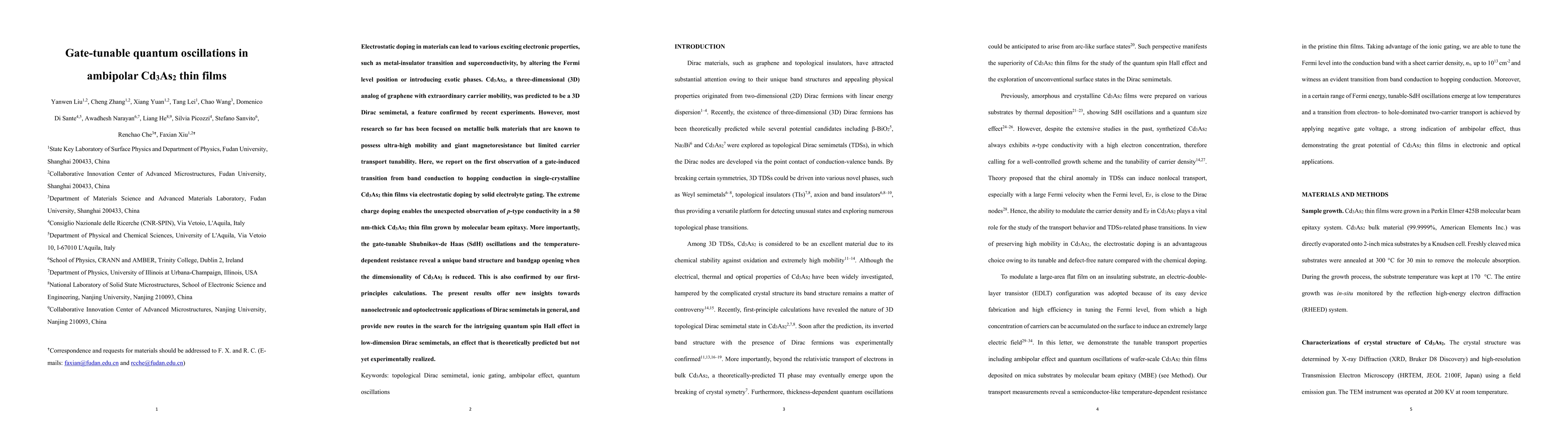 This paper reports on the first observation of gate-induced transitions in Cd3As2 thin films, revealing p-type conductivity and gate-tunable quantum oscillations. These findings highlight unique band structure changes and potential for new nanoelectronic applications.