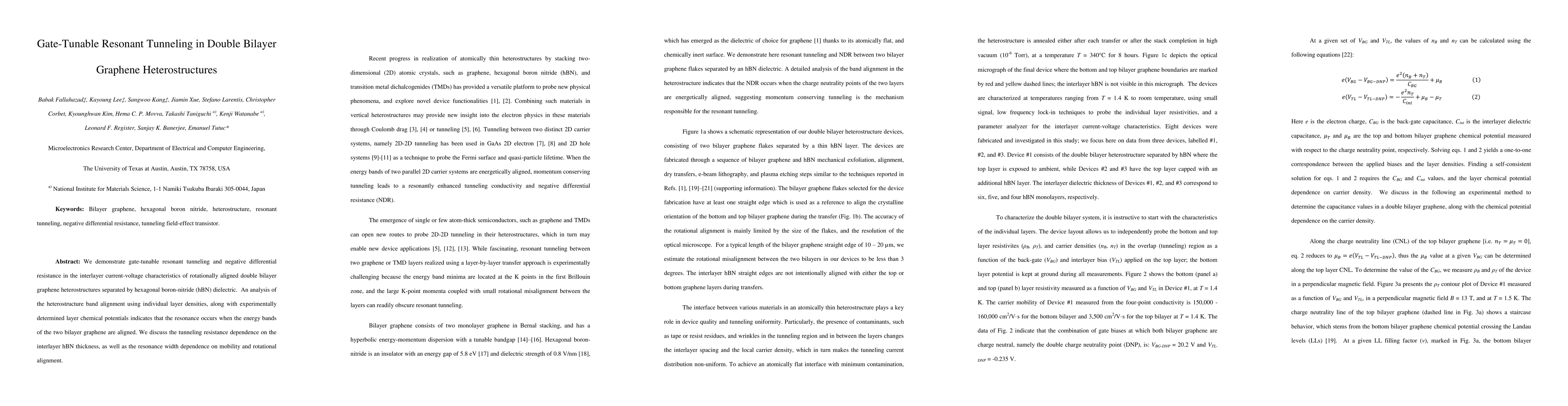 This study demonstrates gate-tunable resonant tunneling and negative differential resistance in double bilayer graphene heterostructures separated by hBN. The resonance occurs when the energy bands of the graphene layers align, with variations in hBN thickness affecting tunneling resistance.