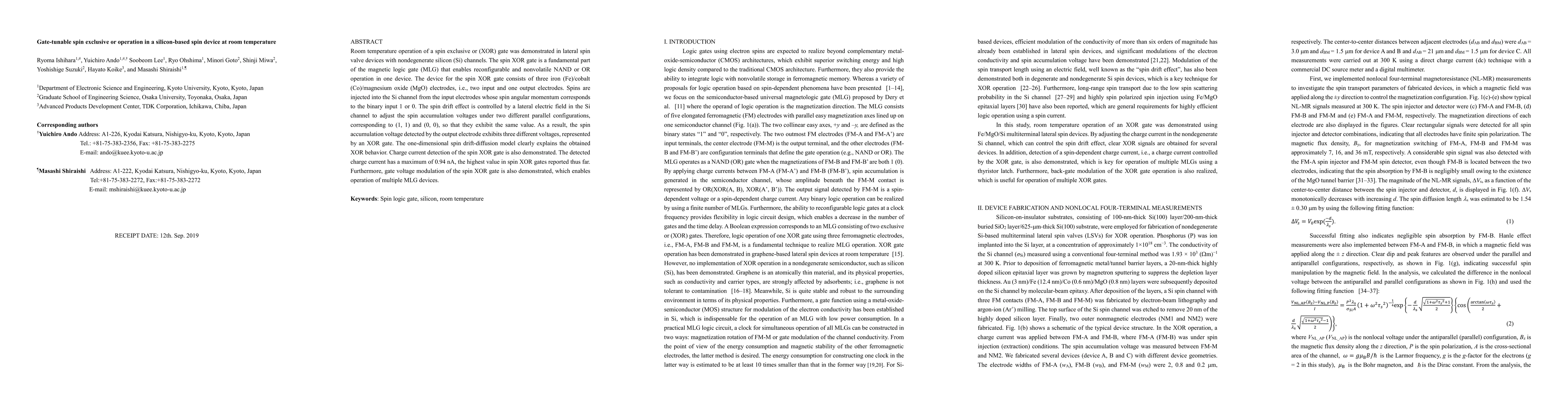This paper demonstrates room temperature operation of a spin exclusive or (XOR) gate in silicon-based spin devices using lateral spin valve technology. The device, consisting of three Fe/Co/MgO electrodes, shows distinct voltage outputs corresponding to XOR logic operations, with a maximum charge current of 0.94 nA, and is tunable via gate voltage for multiple magnetic logic gate operations.