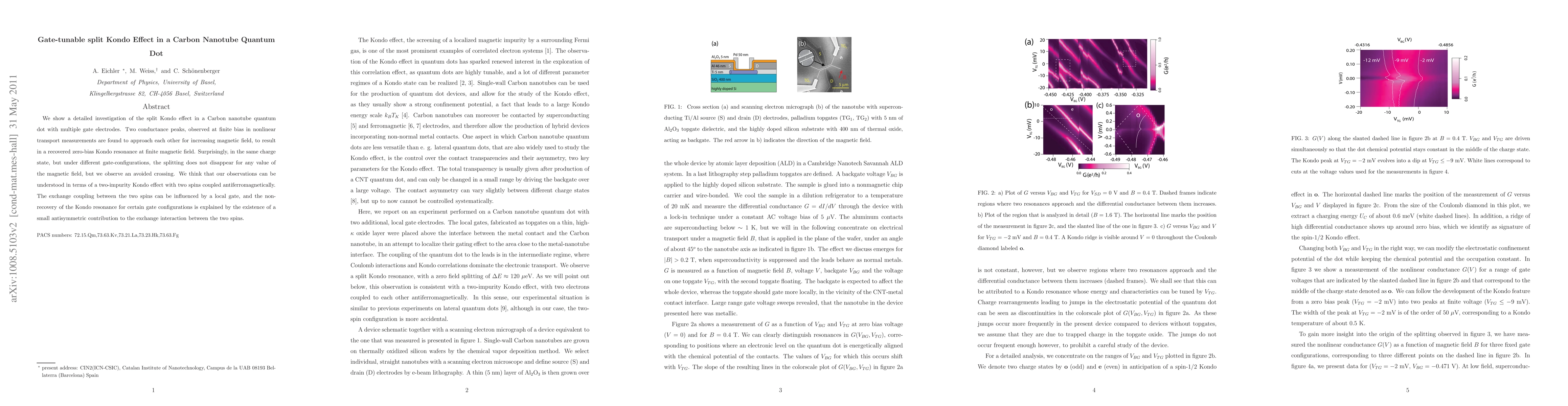 We show a detailed investigation of the split Kondo effect in a carbon nanotube quantum dot with multiple gate electrodes. It is found that the splitting decreases for increasing magnetic field, to result in a recovered zero-bias Kondo resonance at finite magnetic field. Surprisingly, in the same charge state, but under different gate-configurations, the splitting does not disappear for any value of the magnetic field, but we observe an avoided crossing of two high-conductance lines. We think that our observations can be understood in terms of a two-impurity Kondo effect with two spins coupled antiferromagnetically. The exchange coupling between the two spins can be influenced by a local gate, and the non-recovery of the Kondo resonance for certain gate configurations is explained by the existence of a small antisymmetric contribution to the exchange interaction between the two spins.