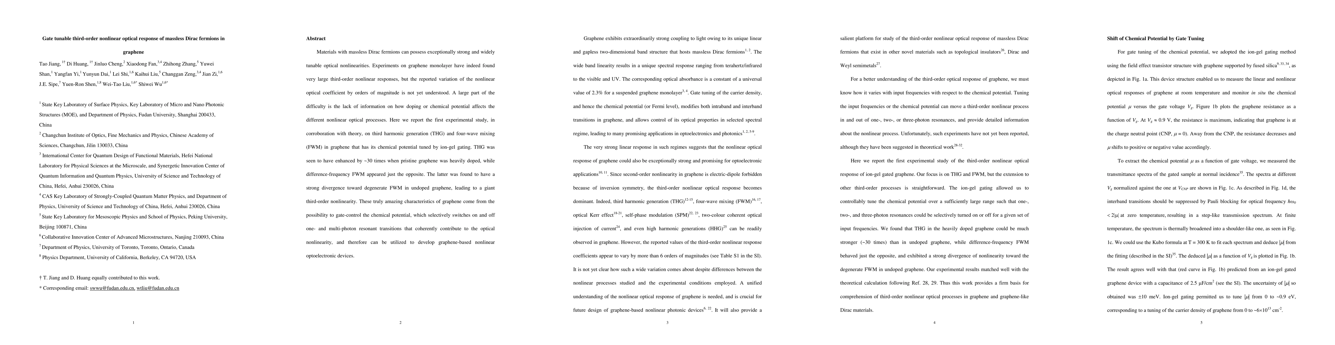 Materials with massless Dirac fermions can possess exceptionally strong and widely tunable optical nonlinearities. Experiments on graphene monolayer have indeed found very large third-order nonlinear responses, but the reported variation of the nonlinear optical coefficient by orders of magnitude is not yet understood. A large part of the difficulty is the lack of information on how doping or chemical potential affects the different nonlinear optical processes. Here we report the first experimental study, in corroboration with theory, on third harmonic generation (THG) and four-wave mixing (FWM) in graphene that has its chemical potential tuned by ion-gel gating. THG was seen to have enhanced by ~30 times when pristine graphene was heavily doped, while difference-frequency FWM appeared just the opposite. The latter was found to have a strong divergence toward degenerate FWM in undoped graphene, leading to a giant third-order nonlinearity. These truly amazing characteristics of graphene come from the possibility to gate-control the chemical potential, which selectively switches on and off one- and multi-photon resonant transitions that coherently contribute to the optical nonlinearity, and therefore can be utilized to develop graphene-based nonlinear optoelectronic devices.