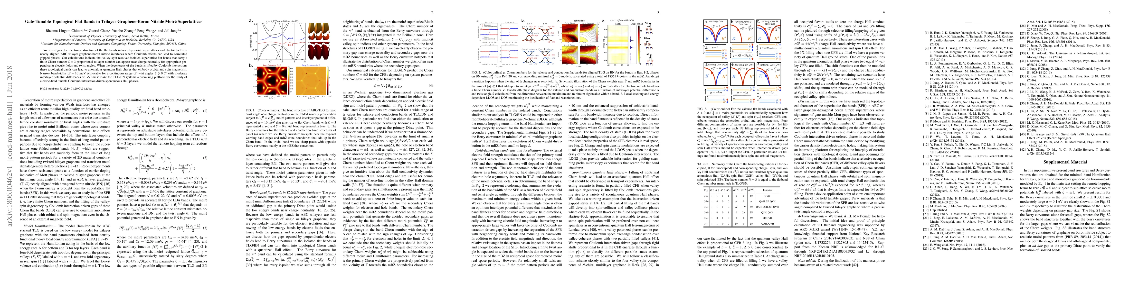 This paper explores the electronic structure of nearly aligned trilayer graphene-boron nitride moiré superlattices, revealing gate-tunable topological flat bands with a Chern number of 3. These bands can induce anomalous quantum Hall phases with orbital and spin magnetism, making the system promising for electric-field controlled magnetism studies.