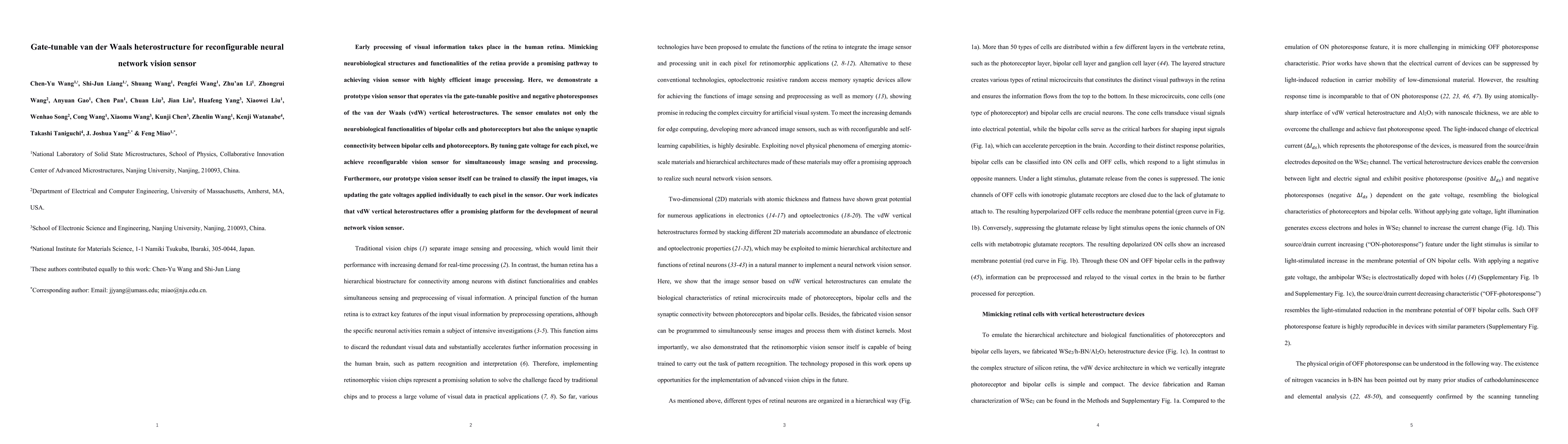 This research presents a prototype vision sensor utilizing gate-tunable van der Waals heterostructures to emulate neurobiological retinal functions, enabling reconfigurable image sensing and processing. The sensor can be trained to classify images by adjusting gate voltages for individual pixels, indicating potential for neural network vision sensors.