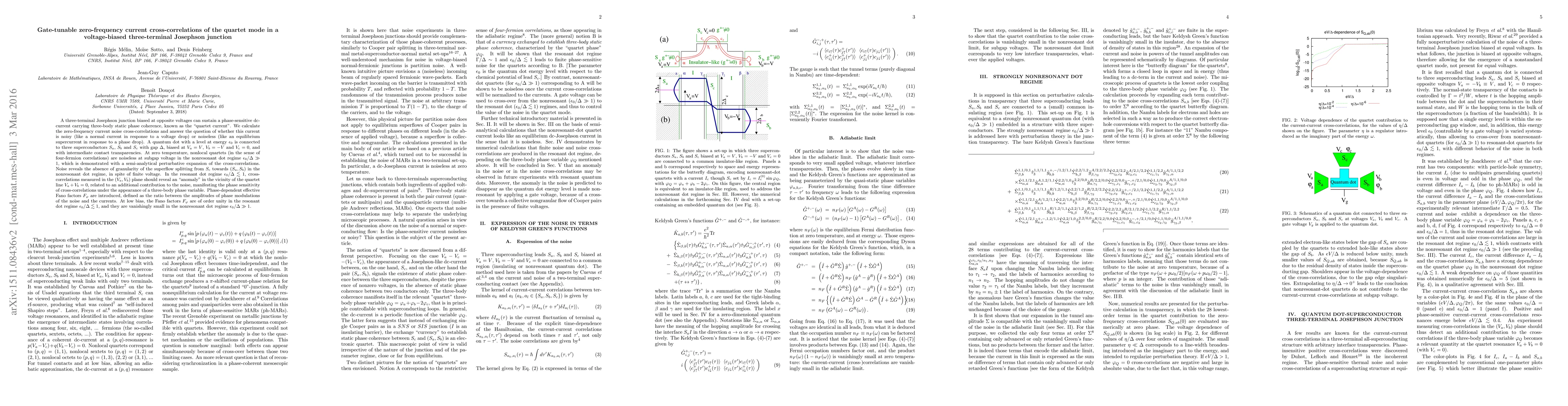 A three-terminal Josephson junction biased at opposite voltages can sustain a phase-sensitive dc-current carrying three-body static phase coherence, known as the "quartet current". We calculate the zero-frequency current noise cross-correlations and answer the question of whether this current is noisy (like a normal current in response to a voltage drop) or noiseless (like an equilibrium supercurrent in response to a phase drop). A quantum dot with a level at energy $\epsilon_0$ is connected to three superconductors $S_a$, $S_b$ and $S_c$ with gap $\Delta$, biased at $V_a=V$, $V_b=-V$ and $V_c=0$, and with intermediate contact transparencies. At zero temperature, nonlocal quartets (in the sense of four-fermion correlations) are noiseless at subgap voltage in the nonresonant dot regime $\epsilon_0/\Delta\gg 1$, which is demonstrated with a semi-analytical perturbative expansion of the cross-correlations. Noise reveals the absence of granularity of the superflow splitting from $S_c$ towards $(S_a,S_b)$ in the nonresonant dot regime, in spite of finite voltage. In the resonant dot regime $\epsilon_0/\Delta< 1$, cross-correlations measured in the $(V_a,V_b)$ plane should reveal an "anomaly" in the vicinity of the quartet line $V_a+V_b=0$, related to an additional contribution to the noise, manifesting the phase sensitivity of cross-correlations under the appearance of a three-body phase variable. Phase-dependent effective Fano factors $F_\varphi$ are introduced, defined as the ratio between the amplitudes of phase modulations of the noise and the currents. At low bias, the Fano factors $F_\varphi$ are of order unity in the resonant dot regime $\epsilon_0/\Delta< 1$, and they are vanishingly small in the nonresonant dot regime $\epsilon_0/\Delta\gg 1$.