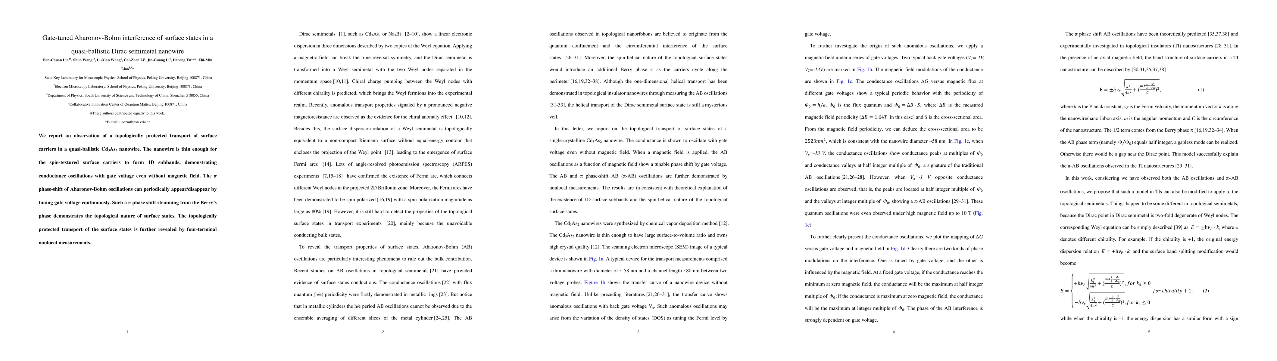 This paper reports the observation of topologically protected transport in a quasi-ballistic Cd3As2 nanowire, where surface carriers exhibit conductance oscillations with gate voltage. A π phase-shift in Aharonov-Bohm oscillations, induced by the Berry's phase, highlights the topological nature of the surface states, confirmed by four-terminal nonlocal measurements.