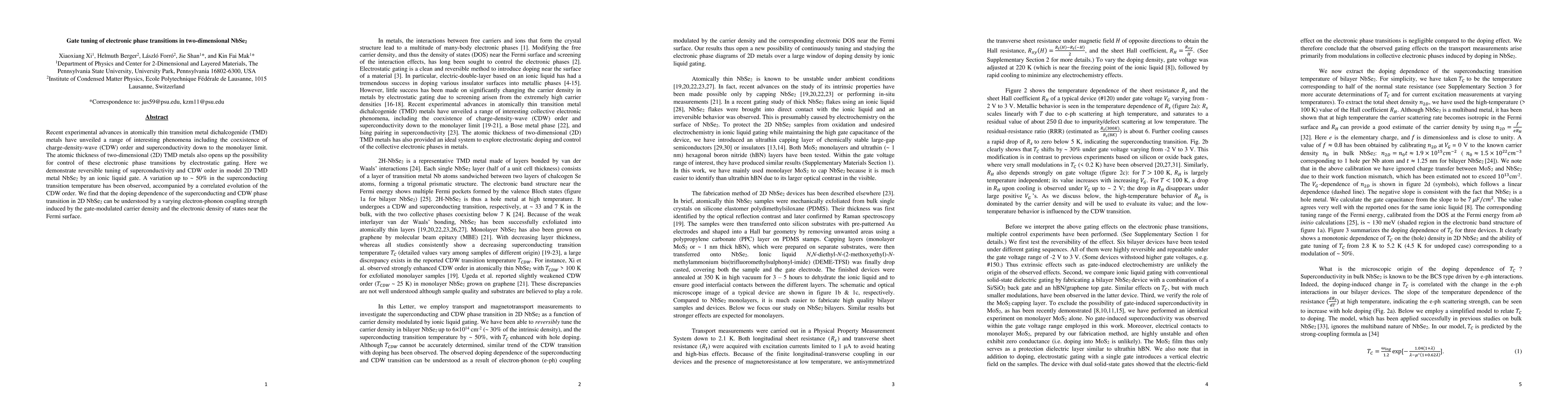 This paper demonstrates reversible tuning of superconductivity and charge-density-wave order in two-dimensional NbSe$_2$ using an ionic liquid gate, showing a ~50% change in superconducting transition temperature. The findings suggest that the gate-modulated carrier density influences the electron-phonon coupling strength, affecting both electronic phase transitions.