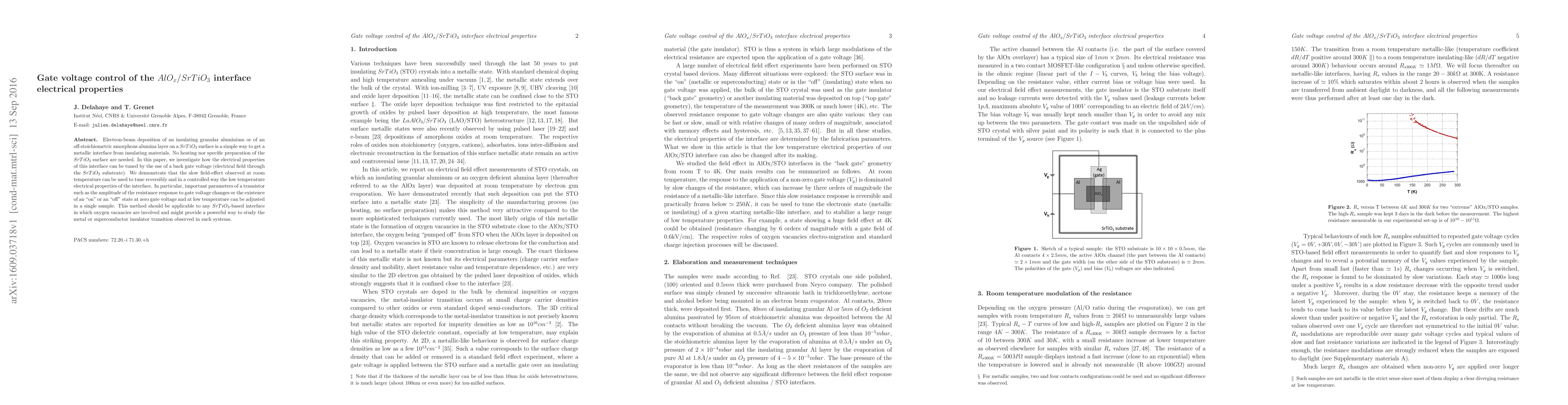 Electron-beam deposition of an insulating granular aluminium or of an off-stoichiometric amorphous alumina layer on a $SrTiO_3$ surface is a simple way to get a metallic interface from insulating materials. No heating nor specific preparation of the $SrTiO_3$ surface are needed. In this paper, we investigate how the electrical properties of this interface can be tuned by the use of a back gate voltage (electrical field through the $SrTiO_3$ substrate). We demonstrate that the slow field-effect observed at room temperature can be used to tune reversibly and in a controlled way the low temperature electrical properties of the interface. In particular, important parameters of a transistor such as the amplitude of the resistance response to gate voltage changes or the existence of an "on" or an "off" state at zero gate voltage and at low temperature can be adjusted in a single sample. This method should be applicable to any $SrTiO_3$-based interface in which oxygen vacancies are involved and might provide a powerful way to study the metal or superconductor insulator transition observed in such systems.
