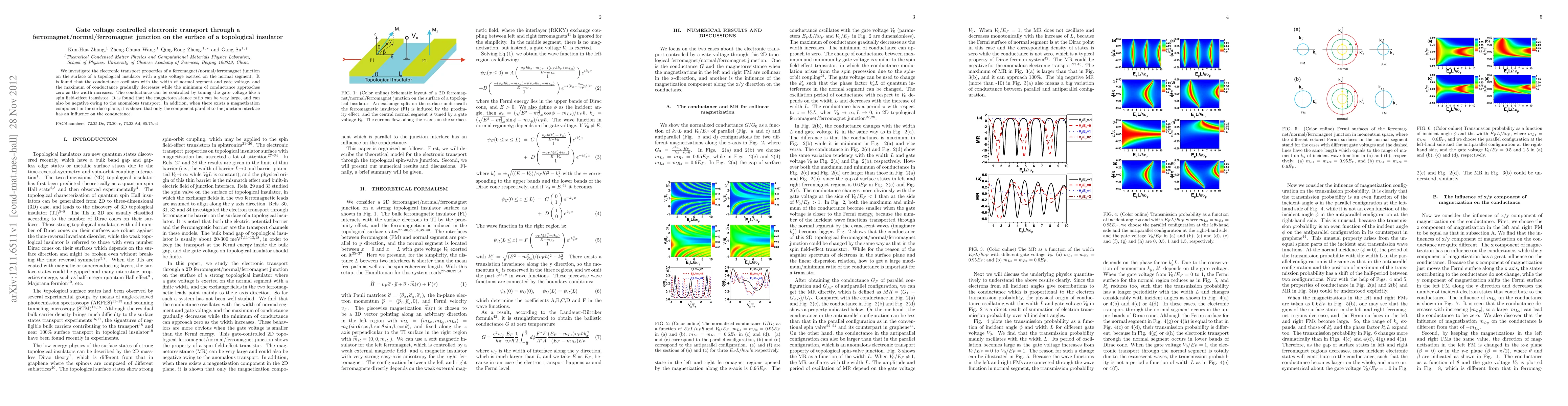 We investigate the electronic transport properties of a ferromagnet/normal/ferromagnet junction on the surface of a topological insulator with a gate voltage exerted on the normal segment. It is found that the conductance oscillates with the width of normal segment and gate voltage, and the maximum of conductance gradually decreases while the minimum of conductance approaches zero as the width increases. The conductance can be controlled by tuning the gate voltage like a spin field-effect transistor. It is found that the magnetoresistance ratio can be very large, and can also be negative owing to the anomalous transport. In addition, when there exists a magnetization component in the surface plane, it is shown that only the component parallel to the junction interface has an influence on the conductance.
