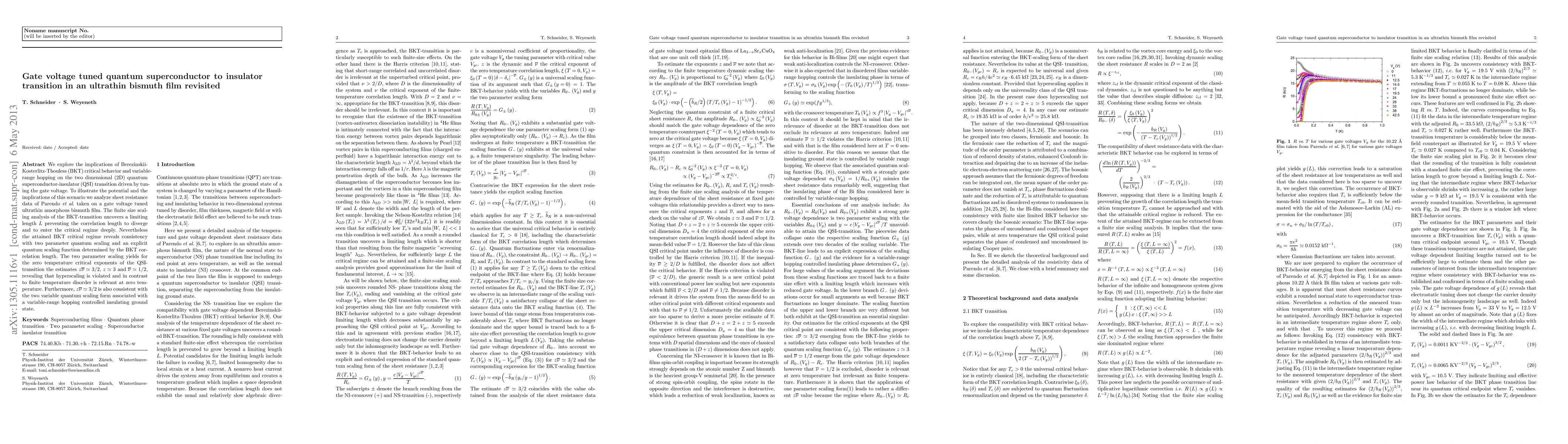 We explore the implications of Berezinskii-Kosterlitz-Thouless (BKT) critical behavior and variable-range hopping on the two dimensional (2D) quantum superconductor-insulator (QSI) transition driven by tuning the gate voltage. To illustrate the potential and the implications of this scenario we analyze sheet resistance data of Parendo et al. taken on a gate voltage tuned ultrathin amorphous bismuth film. The finite size scaling analysis of the BKT-transition uncovers a limiting length preventing the correlation length to diverge and to enter the critical regime deeply. Nevertheless the attained BKT critical regime reveals consistency with two parameter quantum scaling and an explicit quantum scaling function determined by the BKT correlation length. The two parameter scaling yields for the zero temperature critical exponents of the QSI-transition the estimates zn = 3/2, z = 3, and n = 1/2, revealing that hyperscaling is violated and in contrast to finite temperature disorder is relevant at zero temperature. Furthermore, zn = 3/2 is also consistent with the two variable quantum scaling form associated with a variable-range hopping controlled insulating ground state.