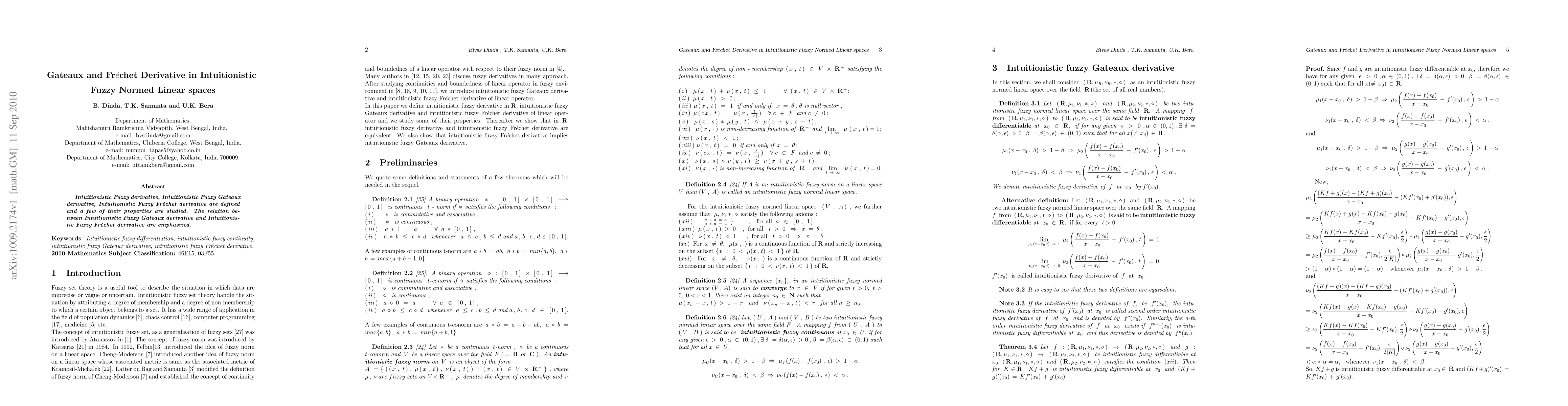 Intuitionistic Fuzzy derivative, Intuitionistic Fuzzy Gateaux derivative, Intuitionistic Fuzzy Fr\'{e}chet derivative are defined and a few of their properties are studied. The relation between Intuitionistic Fuzzy Gateaux derivative and Intuitionistic Fuzzy Fr\'{e}chet derivative are emphasized.