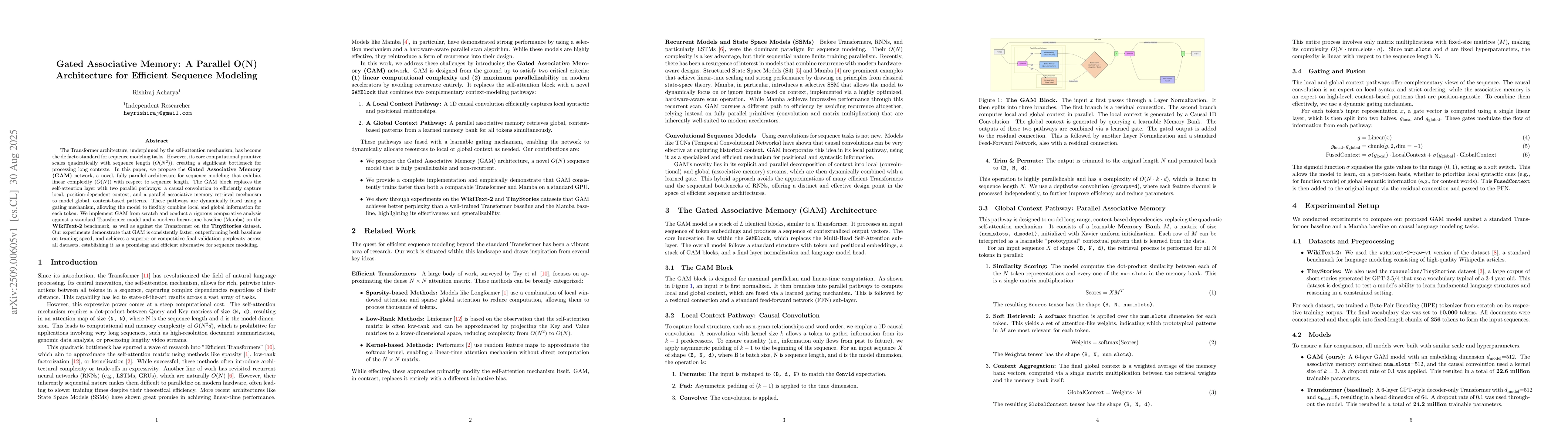 The Transformer architecture, underpinned by the self-attention mechanism, has become the de facto standard for sequence modeling tasks. However, its core computational primitive scales quadratically with sequence length (O(N^2)), creating a significant bottleneck for processing long contexts. In this paper, we propose the Gated Associative Memory (GAM) network, a novel, fully parallel architecture for sequence modeling that exhibits linear complexity (O(N)) with respect to sequence length. The GAM block replaces the self-attention layer with two parallel pathways: a causal convolution to efficiently capture local, position-dependent context, and a parallel associative memory retrieval mechanism to model global, content-based patterns. These pathways are dynamically fused using a gating mechanism, allowing the model to flexibly combine local and global information for each token. We implement GAM from scratch and conduct a rigorous comparative analysis against a standard Transformer model and a modern linear-time baseline (Mamba) on the WikiText-2 benchmark, as well as against the Transformer on the TinyStories dataset. Our experiments demonstrate that GAM is consistently faster, outperforming both baselines on training speed, and achieves a superior or competitive final validation perplexity across all datasets, establishing it as a promising and efficient alternative for sequence modeling.