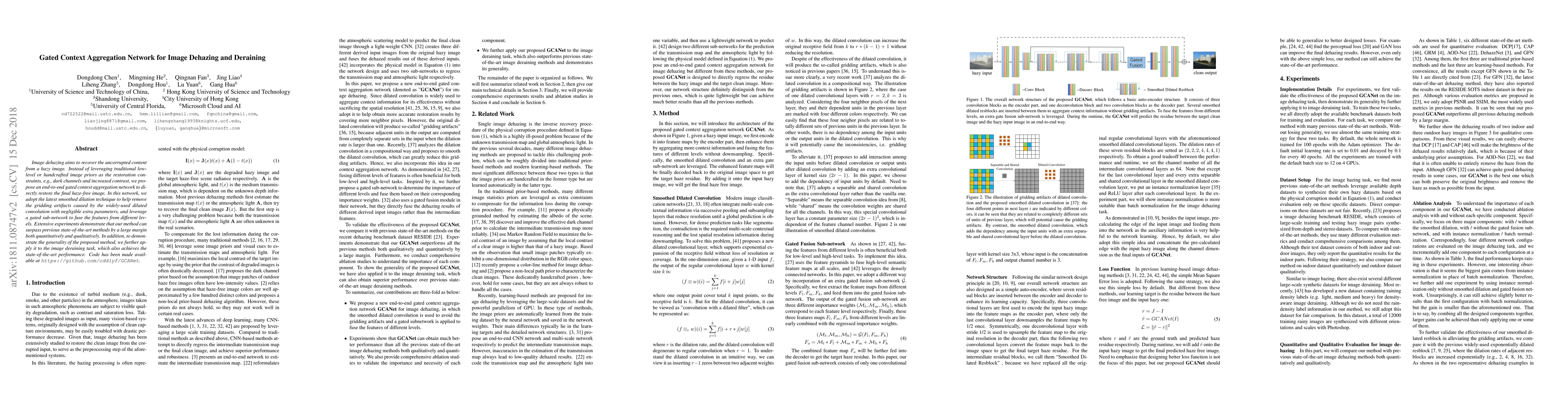 The paper proposes an end-to-end gated context aggregation network for image dehazing and deraining, utilizing smoothed dilation to reduce artifacts and a gated sub-network for feature fusion. The method outperforms previous state-of-the-art techniques and also achieves top performance in image deraining.