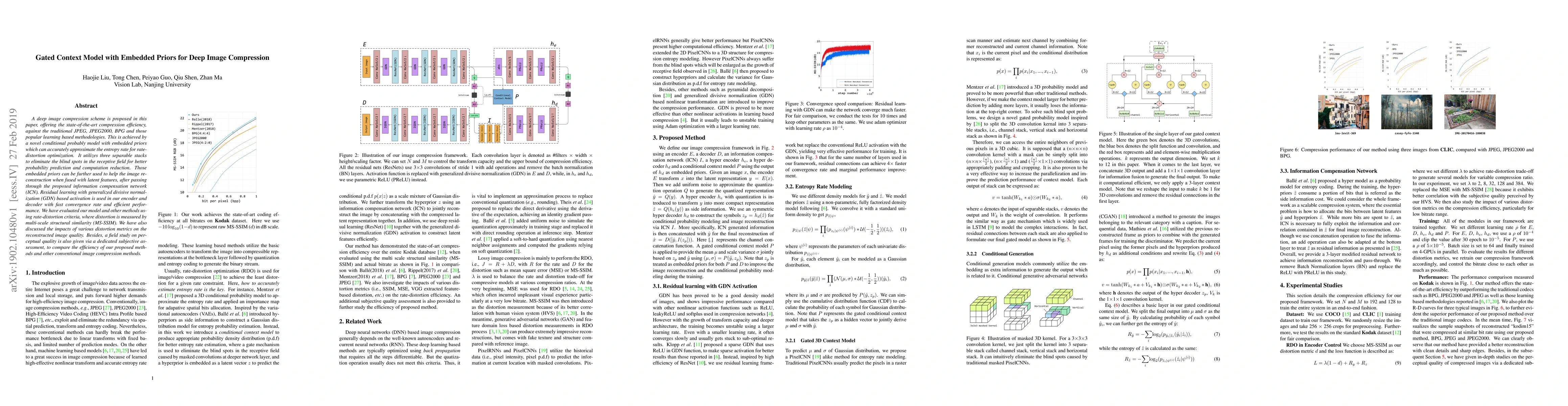 This paper proposes a deep image compression model using a gated context model with embedded priors, achieving state-of-the-art efficiency. It employs a conditional probability model with three separable stacks for better probability prediction and utilizes an information compensation network for improved reconstruction.
