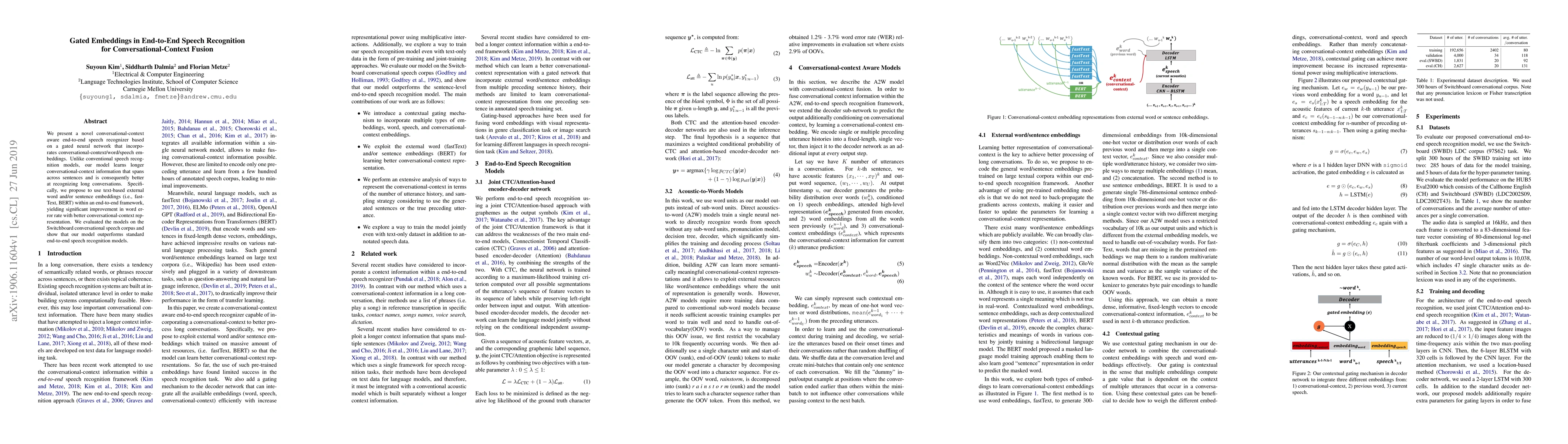 This paper introduces a novel end-to-end speech recognition model that leverages gated neural networks and external word embeddings to enhance conversational-context fusion, significantly improving long-conversation recognition. The model's performance is superior to standard end-to-end models, as demonstrated on the Switchboard corpus.