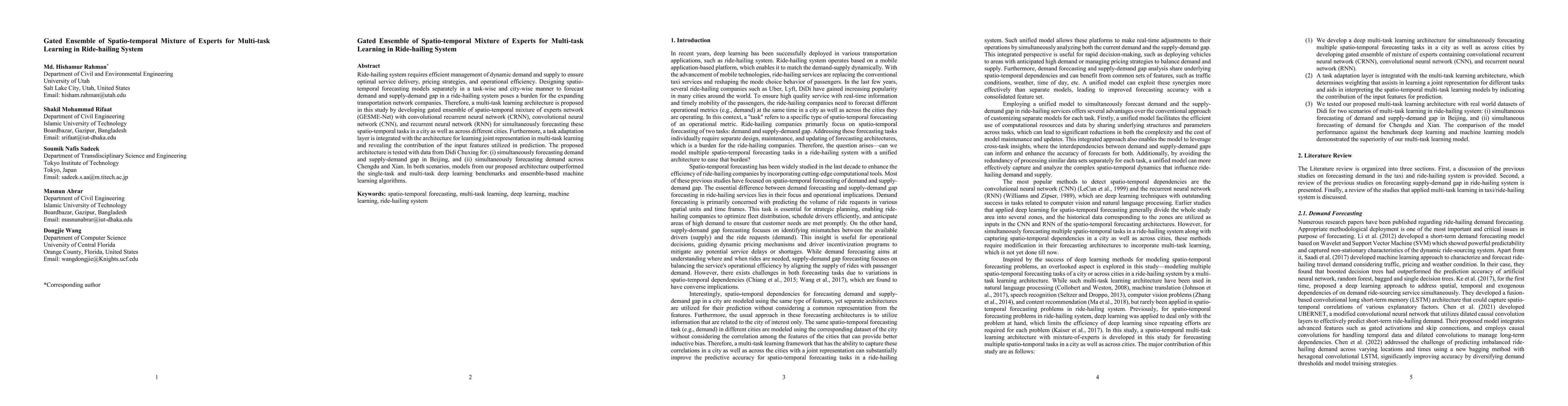 This research proposes a gated ensemble of spatio-temporal mixture of experts network (GESME-Net) for multi-task learning in ride-hailing systems, integrating CNN, CRNN, and RNN to forecast demand and supply-demand gap simultaneously across cities. The model outperformed benchmarks in forecasting tasks using data from Didi Chuxing in Beijing, Chengdu, and Xian.