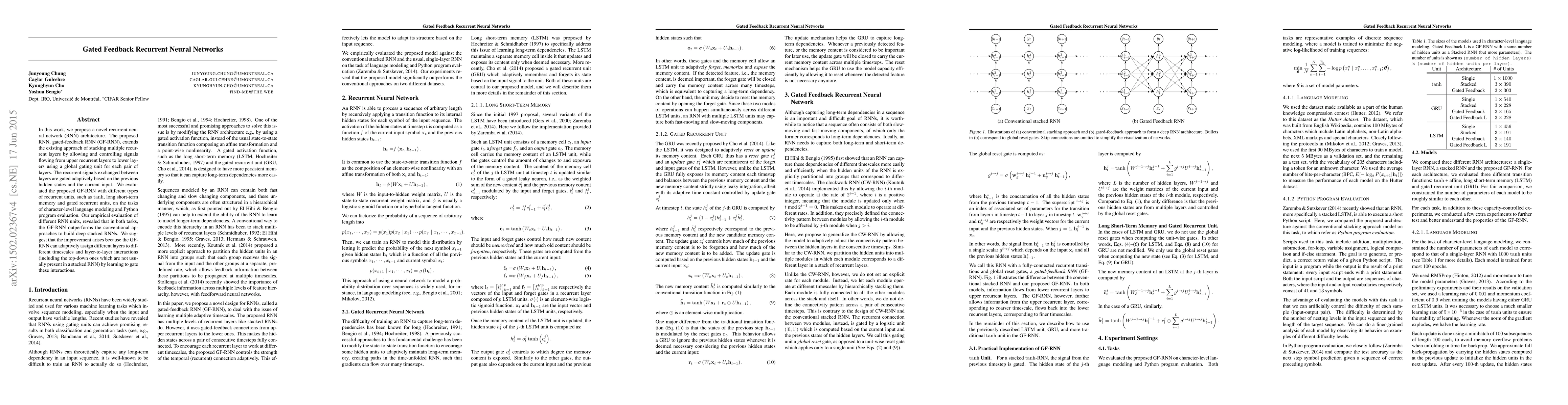 In this work, we propose a novel recurrent neural network (RNN) architecture. The proposed RNN, gated-feedback RNN (GF-RNN), extends the existing approach of stacking multiple recurrent layers by allowing and controlling signals flowing from upper recurrent layers to lower layers using a global gating unit for each pair of layers. The recurrent signals exchanged between layers are gated adaptively based on the previous hidden states and the current input. We evaluated the proposed GF-RNN with different types of recurrent units, such as tanh, long short-term memory and gated recurrent units, on the tasks of character-level language modeling and Python program evaluation. Our empirical evaluation of different RNN units, revealed that in both tasks, the GF-RNN outperforms the conventional approaches to build deep stacked RNNs. We suggest that the improvement arises because the GF-RNN can adaptively assign different layers to different timescales and layer-to-layer interactions (including the top-down ones which are not usually present in a stacked RNN) by learning to gate these interactions.