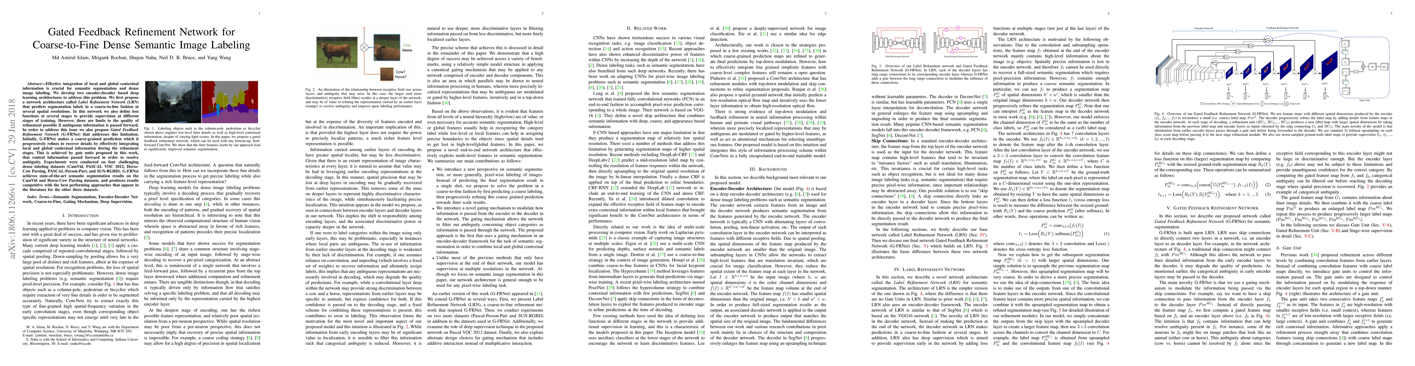 Effective integration of local and global contextual information is crucial for semantic segmentation and dense image labeling. We develop two encoder-decoder based deep learning architectures to address this problem. We first propose a network architecture called Label Refinement Network (LRN) that predicts segmentation labels in a coarse-to-fine fashion at several spatial resolutions. In this network, we also define loss functions at several stages to provide supervision at different stages of training. However, there are limits to the quality of refinement possible if ambiguous information is passed forward. In order to address this issue, we also propose Gated Feedback Refinement Network (G-FRNet) that addresses this limitation. Initially, G-FRNet makes a coarse-grained prediction which it progressively refines to recover details by effectively integrating local and global contextual information during the refinement stages. This is achieved by gate units proposed in this work, that control information passed forward in order to resolve the ambiguity. Experiments were conducted on four challenging dense labeling datasets (CamVid, PASCAL VOC 2012, Horse-Cow Parsing, PASCAL-Person-Part, and SUN-RGBD). G-FRNet achieves state-of-the-art semantic segmentation results on the CamVid and Horse-Cow Parsing datasets and produces results competitive with the best performing approaches that appear in the literature for the other three datasets.