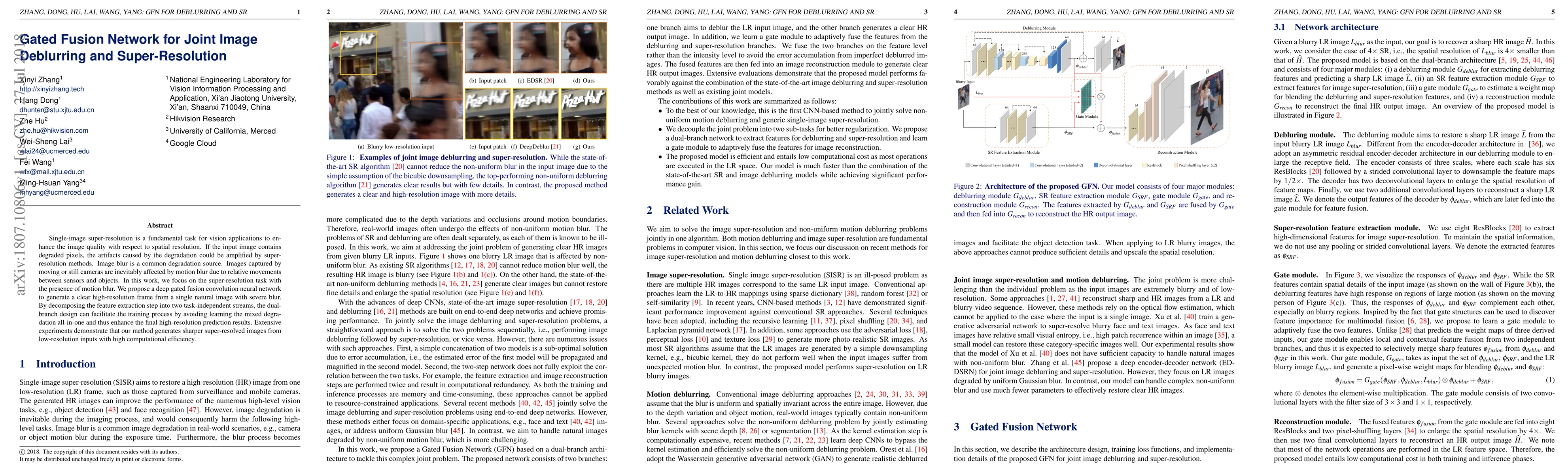 This paper proposes a gated fusion network to tackle the challenge of joint image deblurring and super-resolution from a single blurred image. The dual-branch architecture separates feature extraction for blur and super-resolution, improving training and resulting in sharper, higher-resolution outputs efficiently.