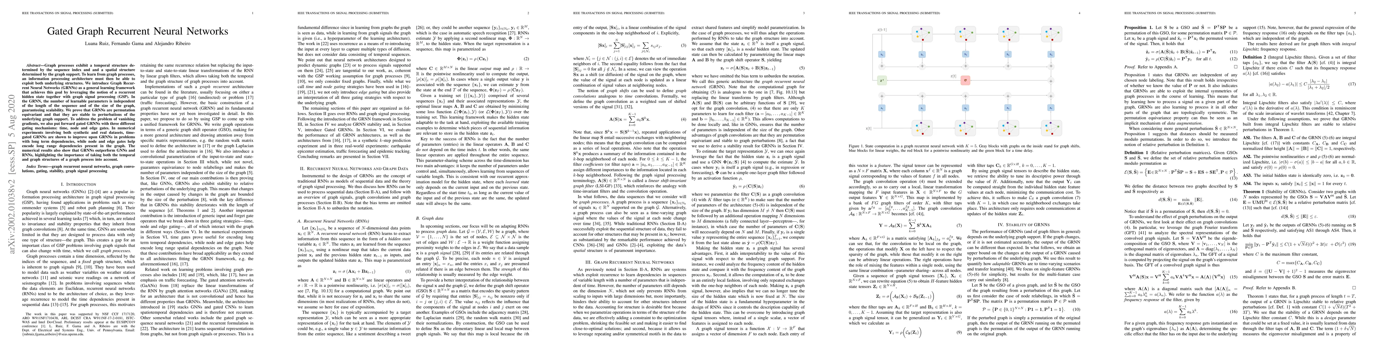 The paper introduces Gated Graph Recurrent Neural Networks (GRNNs) to learn from graph processes that have both temporal and spatial structures. GRNNs leverage recurrent hidden states and graph signal processing, offering scalability and permutation equivariance, while gated mechanisms address gradient vanishing issues. Experiments show that GRNNs outperform GNNs and RNNs, emphasizing the importance of considering both temporal and spatial graph structures.